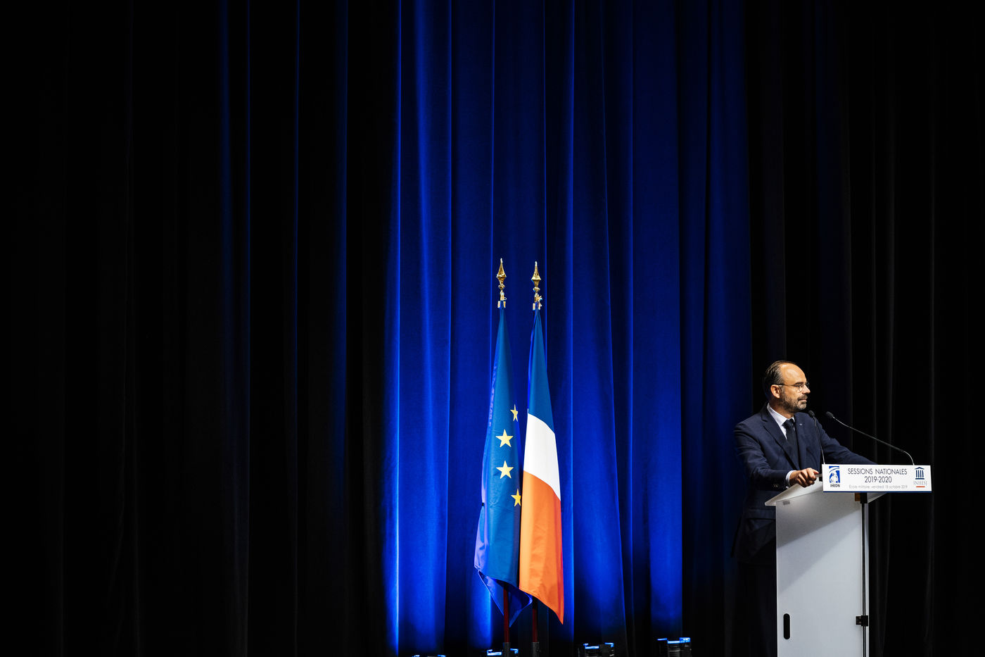 Mr. Édouard PHILIPPE, Prime Minister, with Mrs. Florence PARLY, Minister of the Armed Forces, and Mr. Laurent NUNEZ, Secretary of State to the Minister of the Interior. Speech before the 2019-2020 national sessions of the Institut des hautes études de Défense nationale (IHEDN) and the Institut national des hautes études de la Sécurité et de la Justice (INHESJ). Paris, École militaire, October 18, 2019.