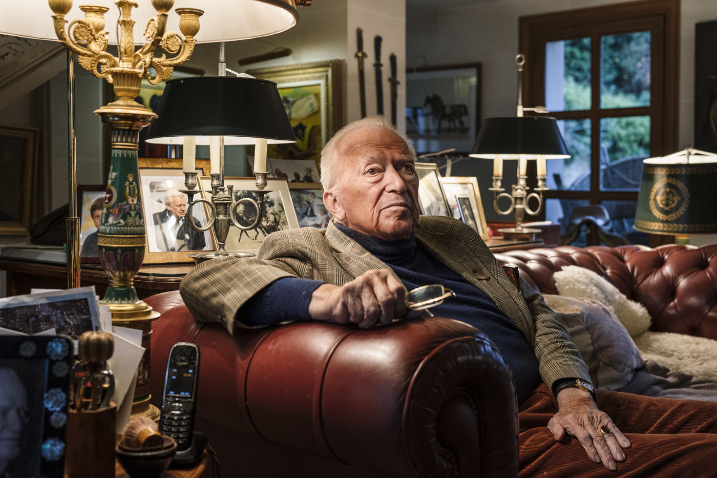Jean-Paul Guerlain in the living room of his property in the Yvelines, France. The companion of the former perfumer of the House of Guerlain, Christina Kragh Michelsen, wants to marry the man she has been living with for years. But Jean-Paul Guerlain's only son, Stephane Guerlain, and his father's guardian, is opposed to their union.