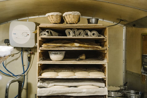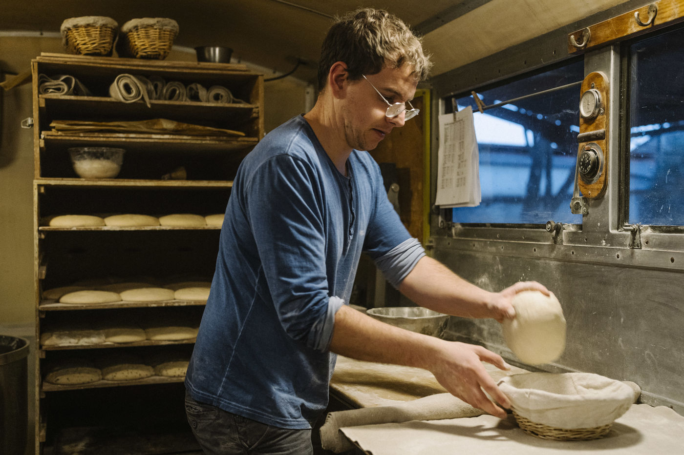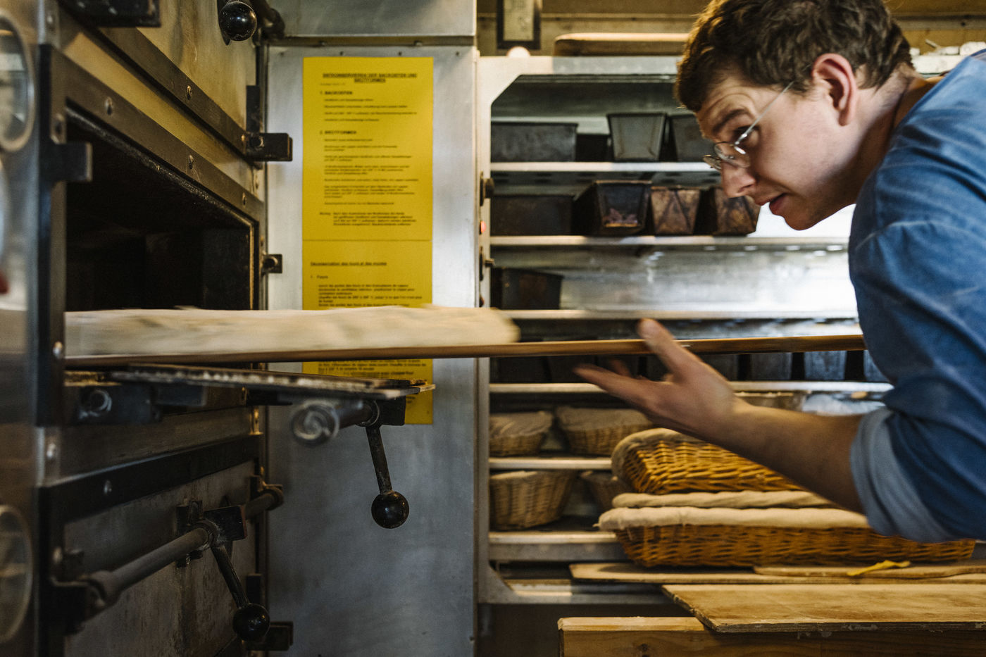 Samuel Paulin, a young peasant baker from Puygouzon (Tarn). After studying psychology and without any training as a baker, he chose to make his bread in a 1968 Swiss army mobile bakery, designed in 1968 to feed soldiers on the battlefield. His bread is made from flours he has produced himself: he selects his own seeds from the 35-hectare wheat field on the family farm, which his farmer father converted to organic farming 25 years ago. He sells his own bread at the markets in and around Albi.