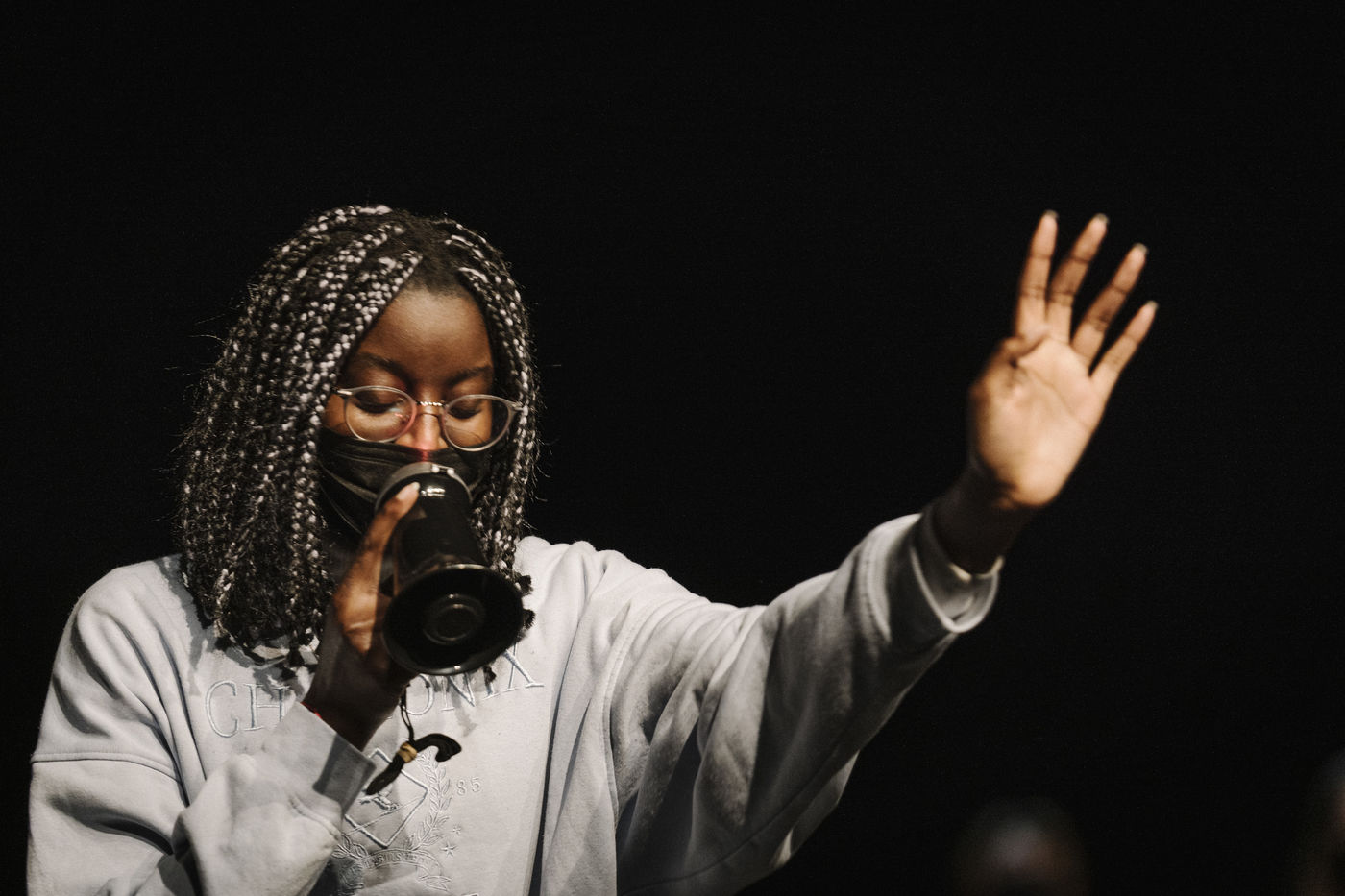 France, Théâtre de Saint-Quentin-en-Yvelines, scène nationale, 2021-05-26. Représentation théâtrale "Juste la fin", création mise en scène par Aurélie Ruby dans le cadre d'un travail d'éducation artistique, développé sur tout le territoire yvelinois, avec la participation de lycéennes et lycéens de différents établissements du département. Photographie de Denis Meyer / Hans Lucas.