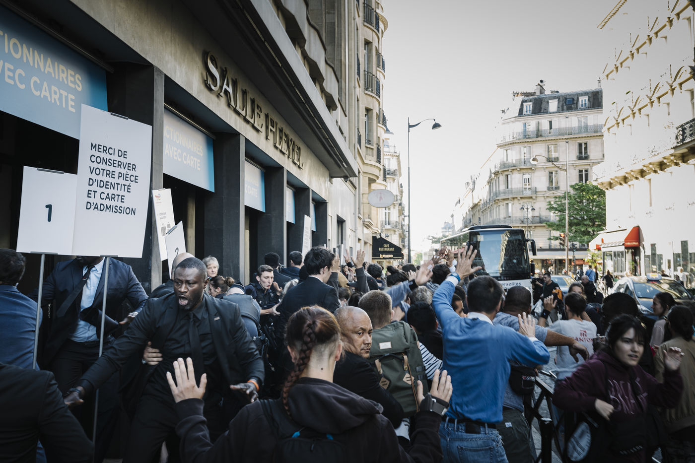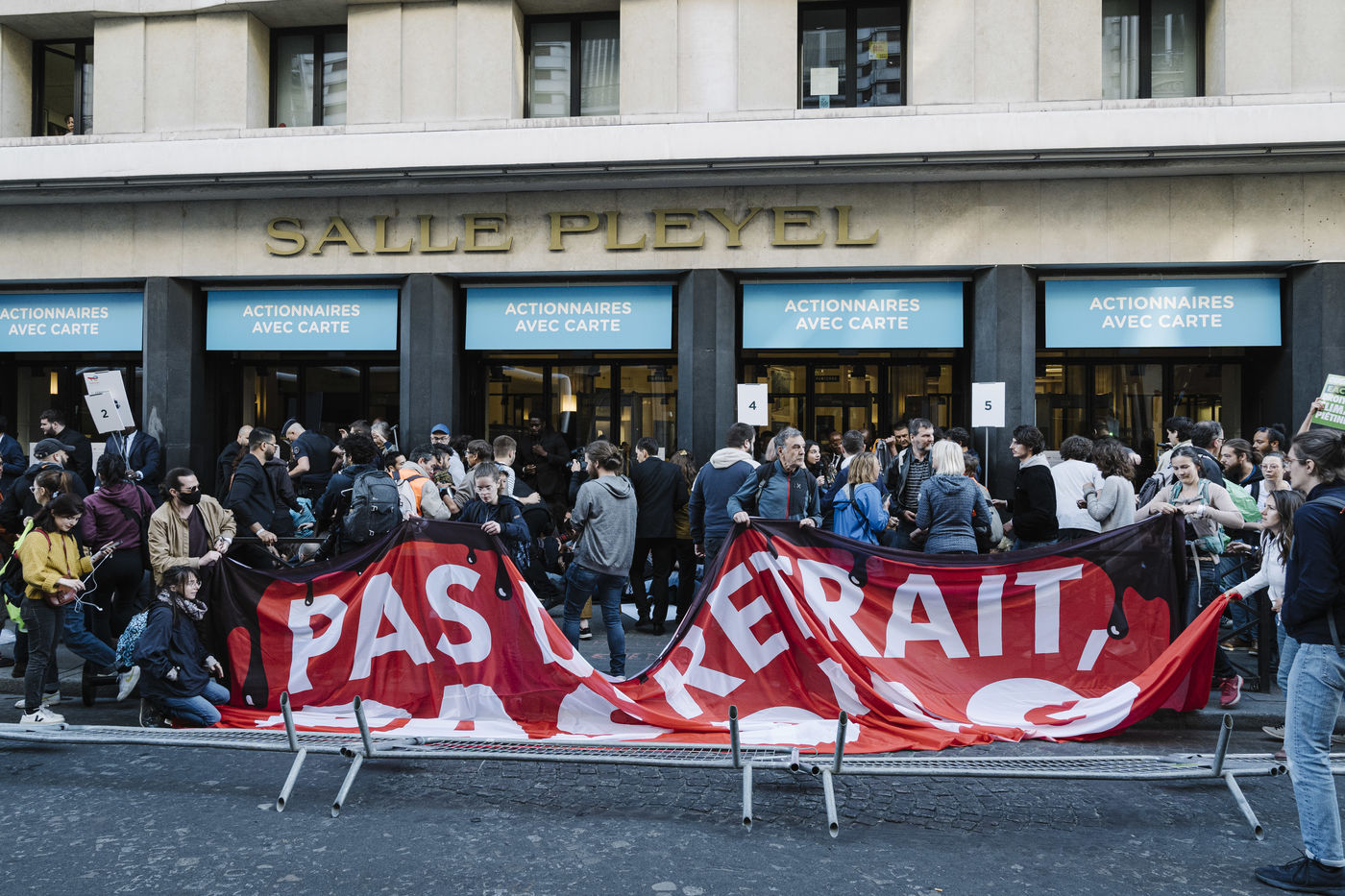 250 climate activists mobilised to block Total's Annual General Meeting, to demand from Patrick Pouyanné concrete and immediate commitments to withdraw from Total's activities in Russia and to stop all fossil fuel projects.