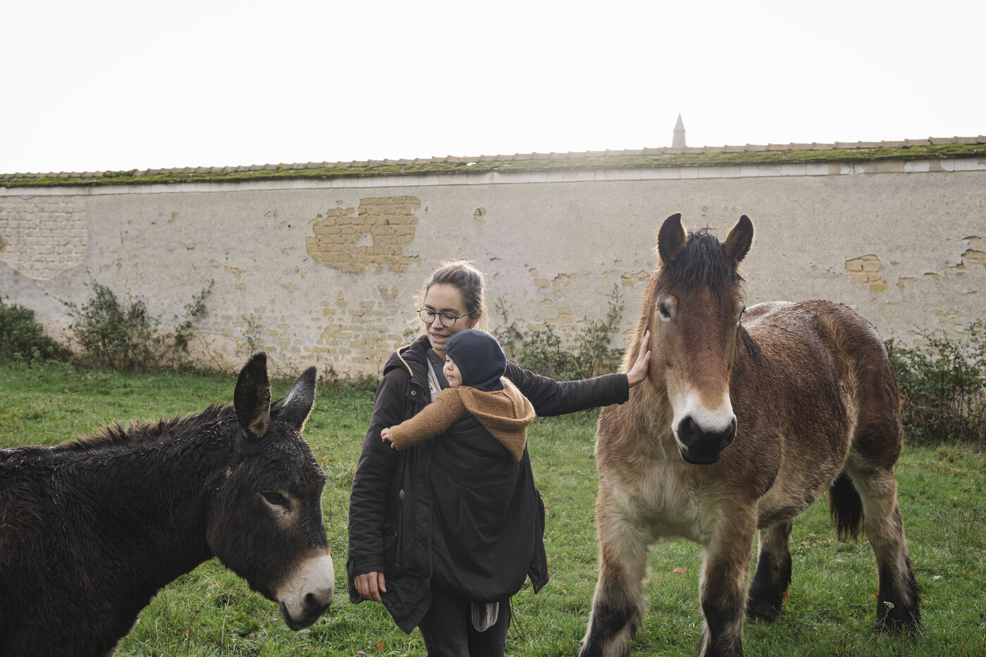 France, Athis, 2023-12-13. Alexia et Pierre-Edouard ont démarré produisent sous abris et en plein champ leurs légumes sans engrais chimiques ni pesticides, sur une parcelle en troisième année de conversion vers l'agriculture biologique. Le travail du sol de la parcelle de maraichage est effectué à l'aide de la traction animale avec leur jument Charlotte.