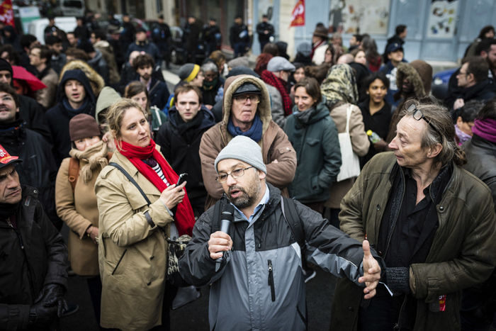Occupation and mobilization of artists and technicians in the entertainment before the Odeon Theatre, the call of CGT Show. Paris, France, April 25, 2016.