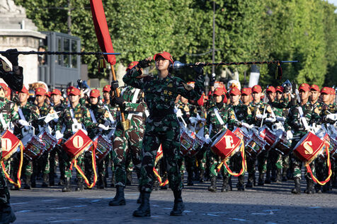The July 14 military parade is a republican tradition intended to mark both the Republic's commitment to its armed forces and the armed forces' commitment to the Republic. To ensure the parade is perfect, numerous rehearsals take place the week before the national holiday, at the Satory base and also on the Champs-Élysées in the early morning, before the city reclaims the grounds. Paris welcomes foreign delegations; this year, a contingent of the Indonesian army is marching, as is the Finnish army.