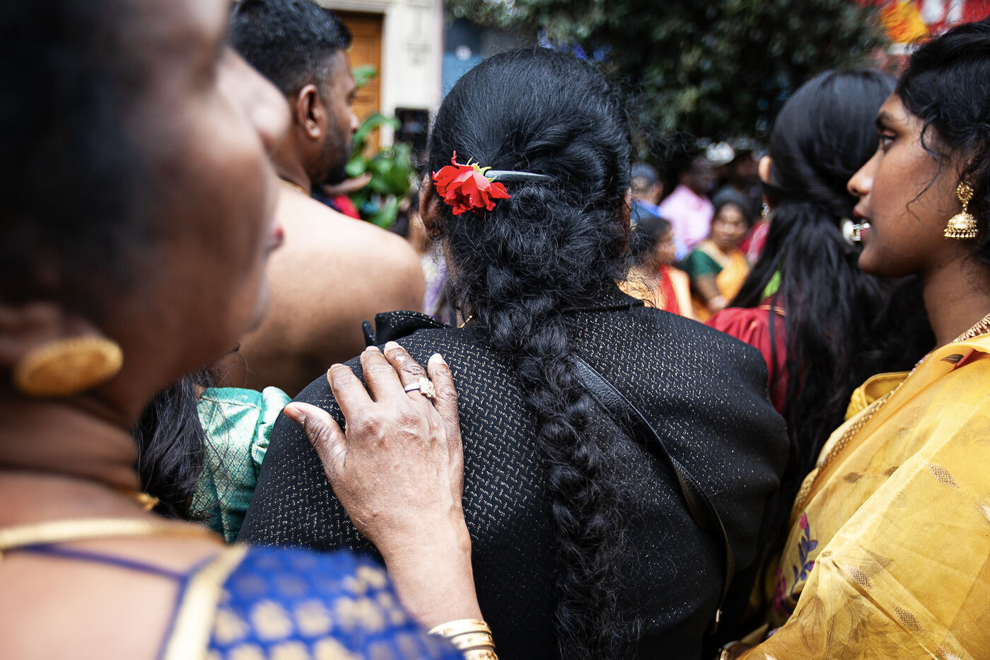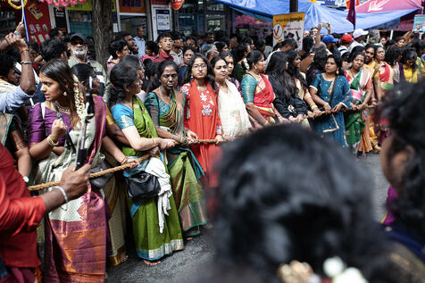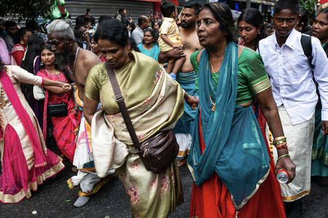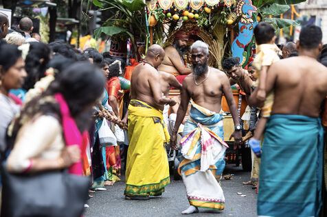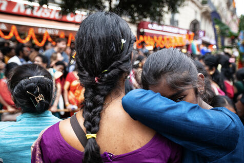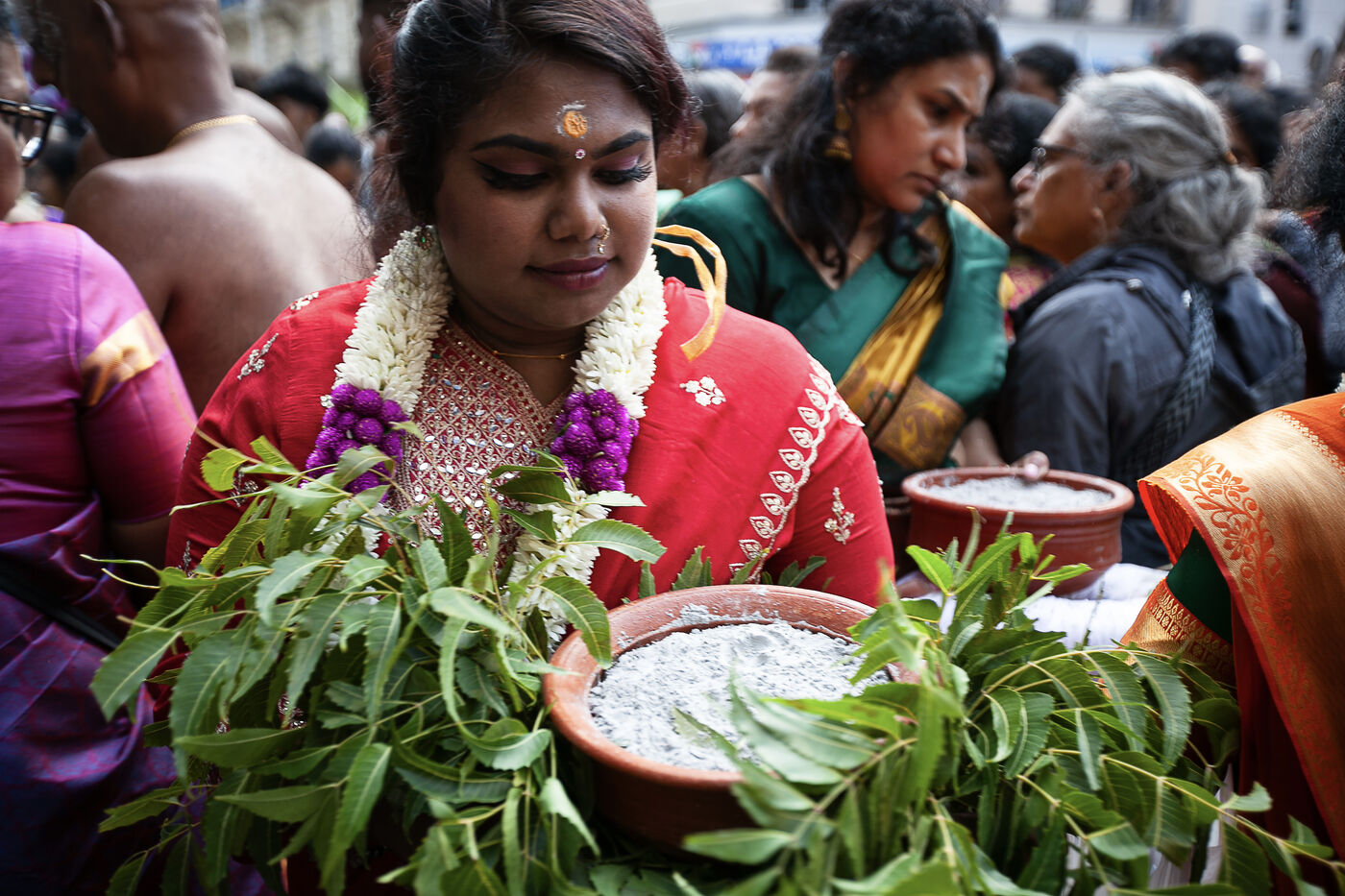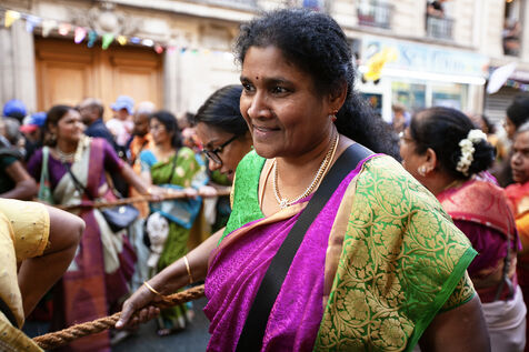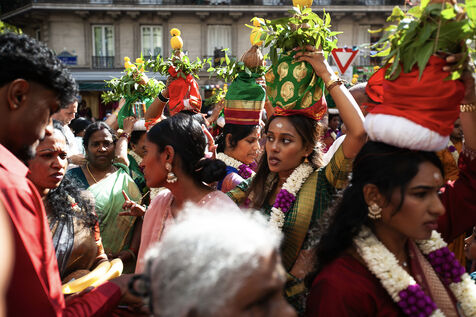 Ganesh, dieu hindou au corps humain et à tête d'éléphant est fêté chaque année dans les rues de Paris. Il attire les bons auspices sur les fidèles. la Communauté part du temple dédié à Ganesh dans le XVIIIe arrondissement de Paris et parcourt le quartier lors d'un dimanche de partage et de fête pour des milliers de participants à la procession.
