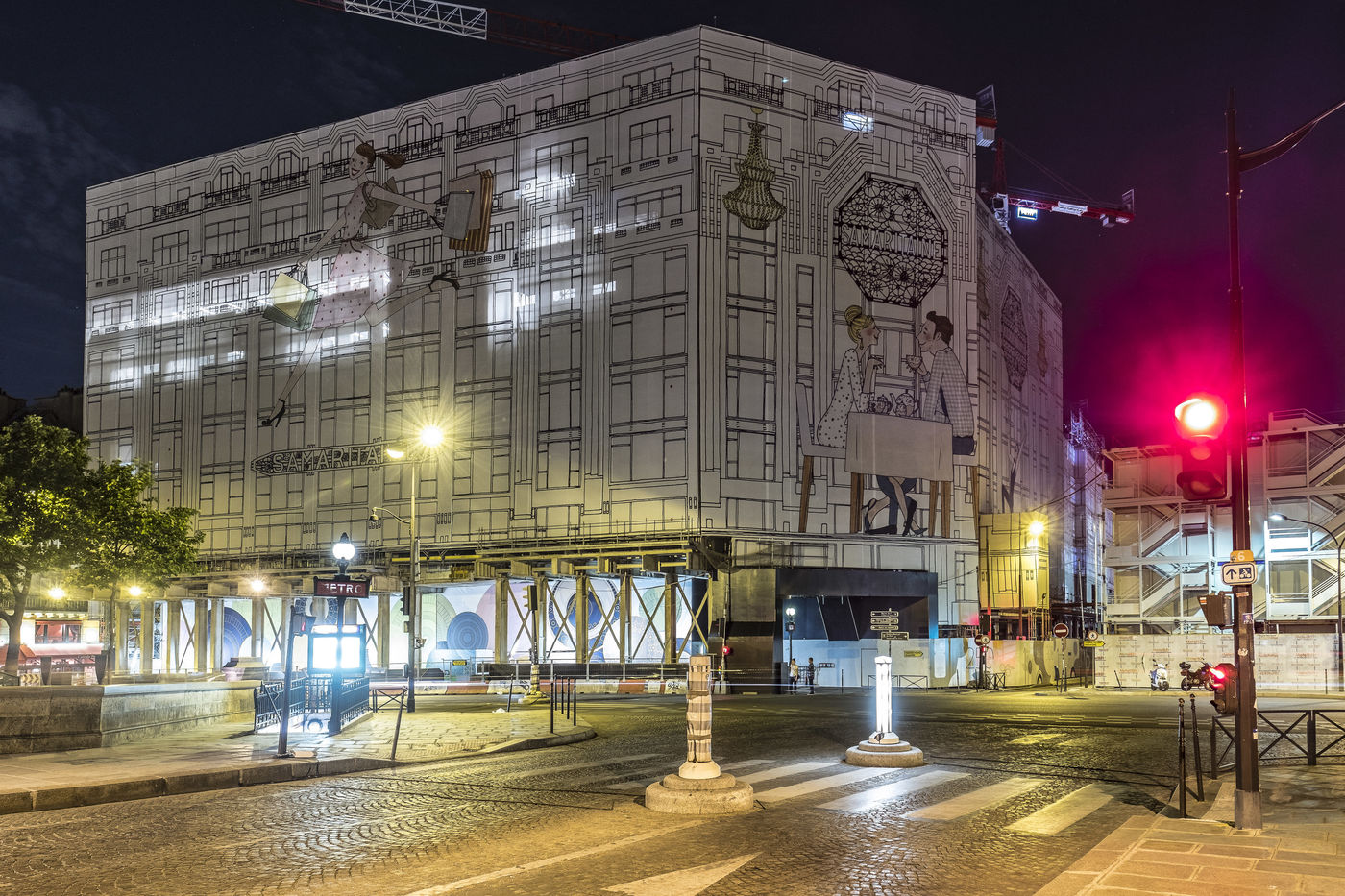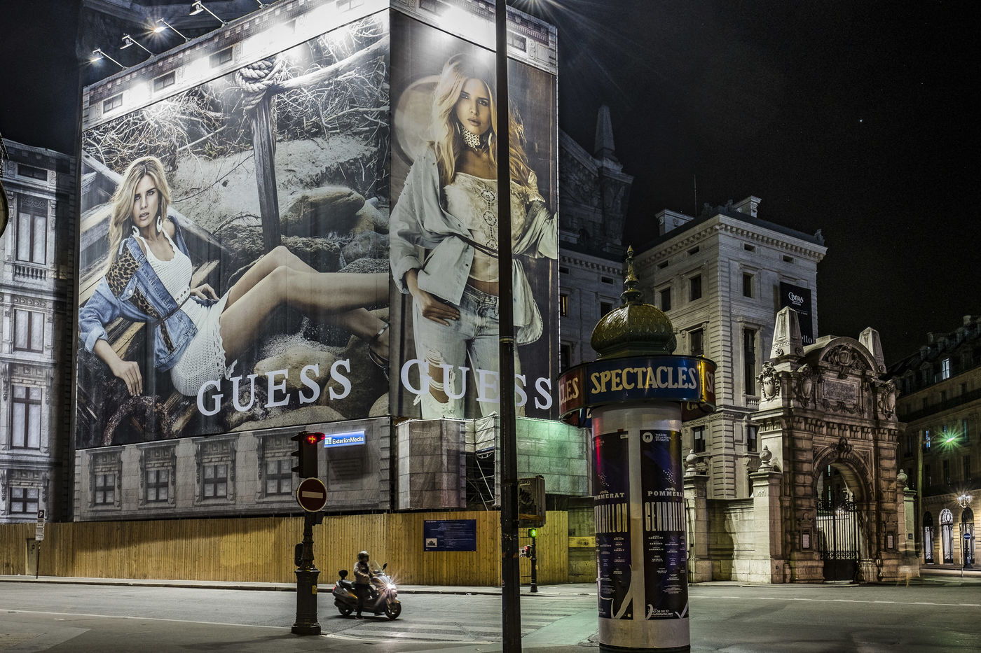 A la nuit tombée, l'impact visuel publicitaire des bâches de façade XXL illuminées créent un territoire d'expression grandiose et unique dans le paysage urbain.