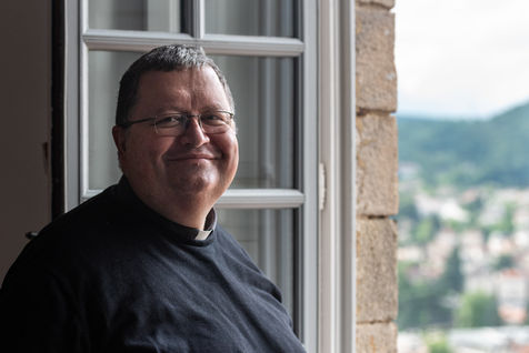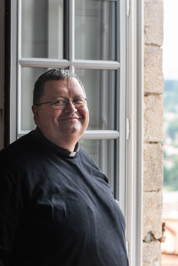 Portraits du Père Jean-Loïc Ollu, recteur de la Cathédrale Notre Dame du Puy au Puy en Velay. C'est de cette ville que part le pélerinage du chemin de Saint Jacques de Compostelle.