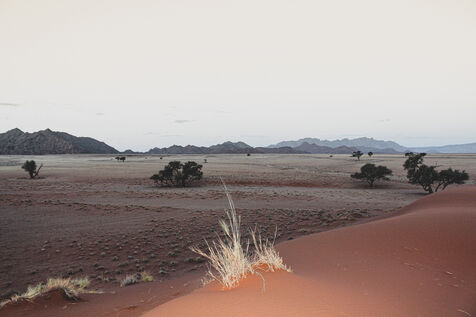 Photographs of deserts in Namibia have been retouched so that the sand becomes as gray as the ashes after a fire. These images are projections: when everything has burned, what will be left? The impression of a nature devastated by fire, where no form of life remains. Grey ashes under a blue sky, human bones, and a sense of calm.