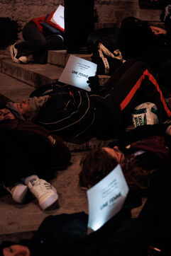 A die-in organized by the feminist association Nous Toutes Rhône took place in front of the Palais de Justice of Lyon on January 11, 2025 to return femmage to victims of femicides in 2024 in France.