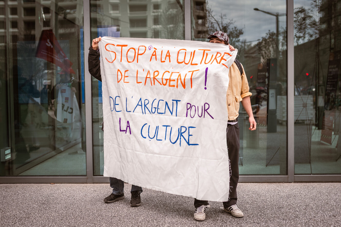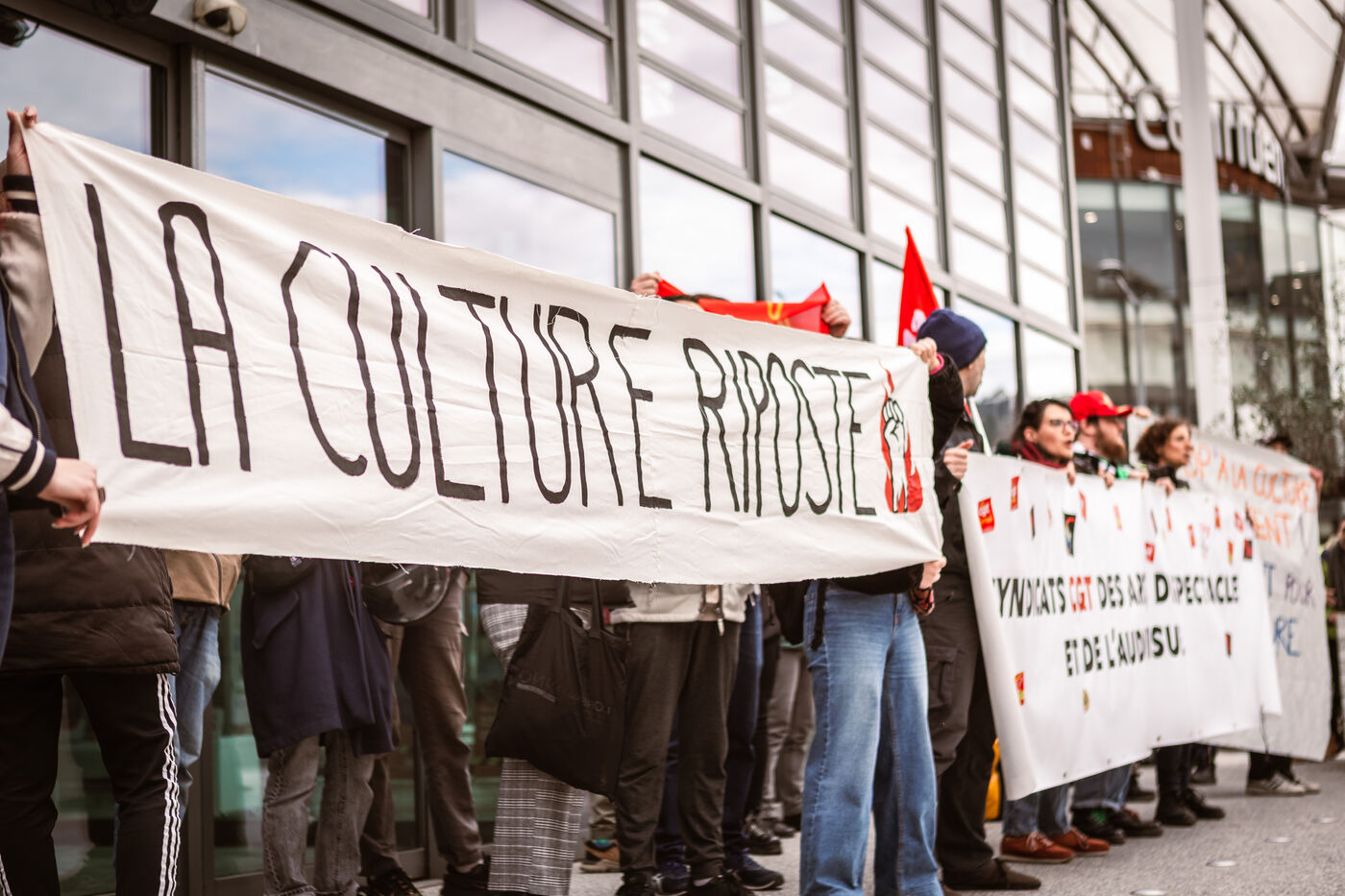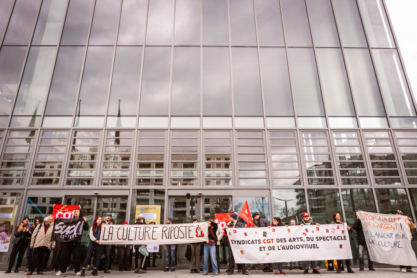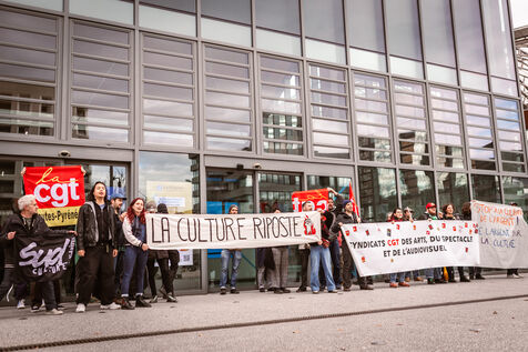 Suite aux annonces budgétaires du gouvernement la culture riposte : gel de la part collective du pass culture, des coupes budgétaires historiques et la baisse de 5,2 millions d'euro du budget culture rien que sur la région Auvergne Rhône-Alpes... De nombreuses mobilisations ont lieux partout en France : un rassemblement a eu lieu devant l'hôtel de région Montrochet à Lyon le 19 mars 2025.