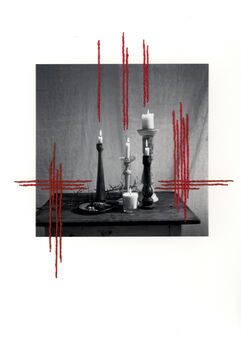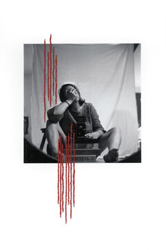 Some of the images are scanned, then the paper is embroidered. The thread pattern weaves a mending, like a repair on painful wounds. In red, like the blood of filiation.