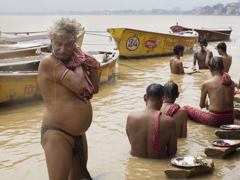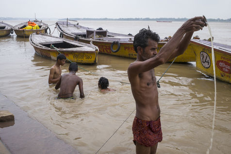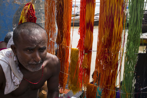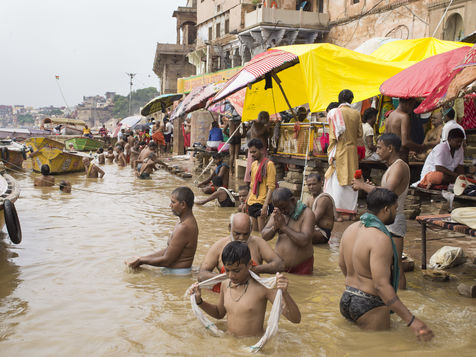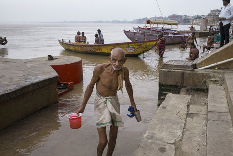 Located on the left bank of the Ganges, Varanasi is the holiest city in Hinduism and Jainism. It hosts the largest number of pilgrims in India. At the end of the monsoon season, the ghats are reduced to a bare minimum as the waters of the Ganges rise