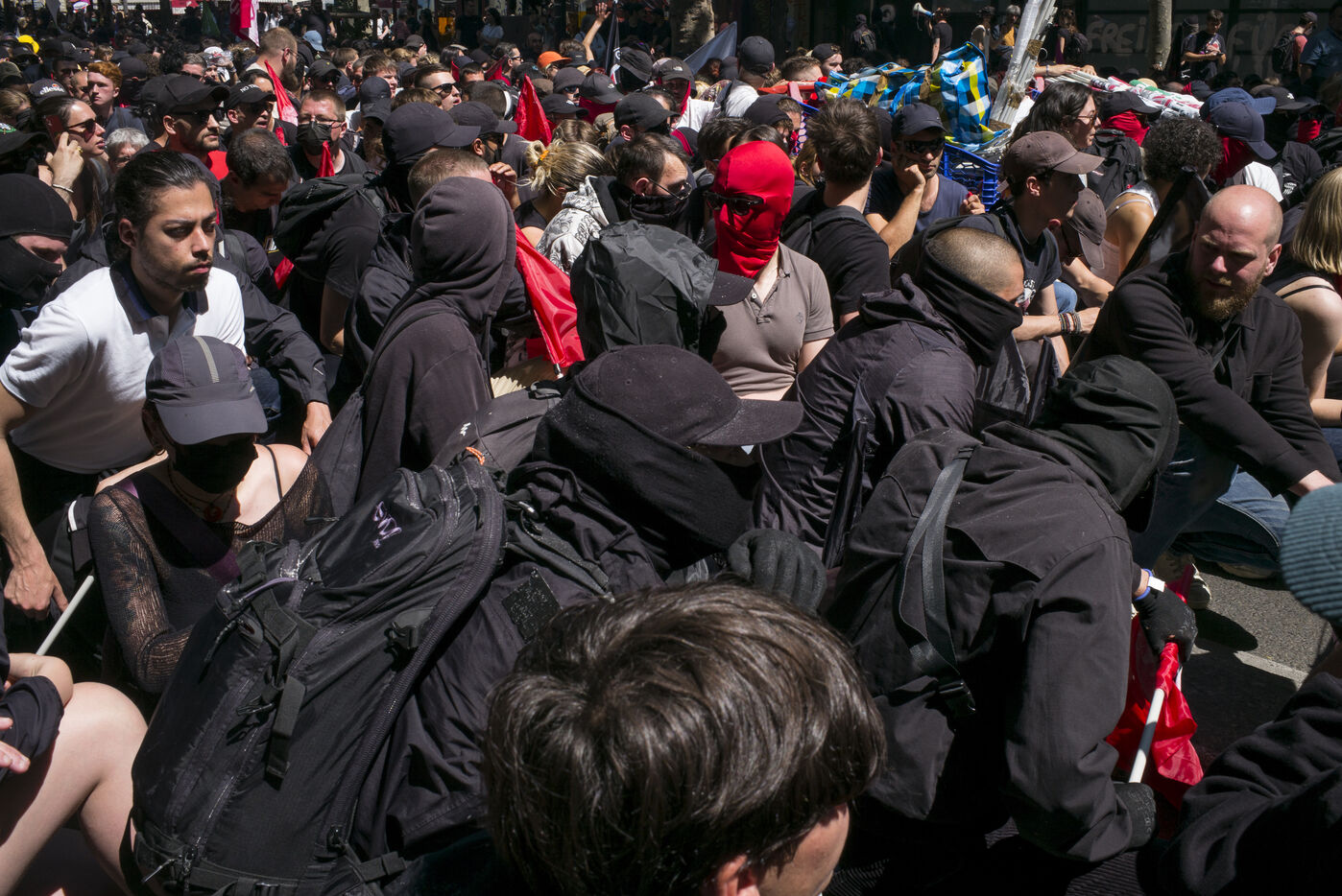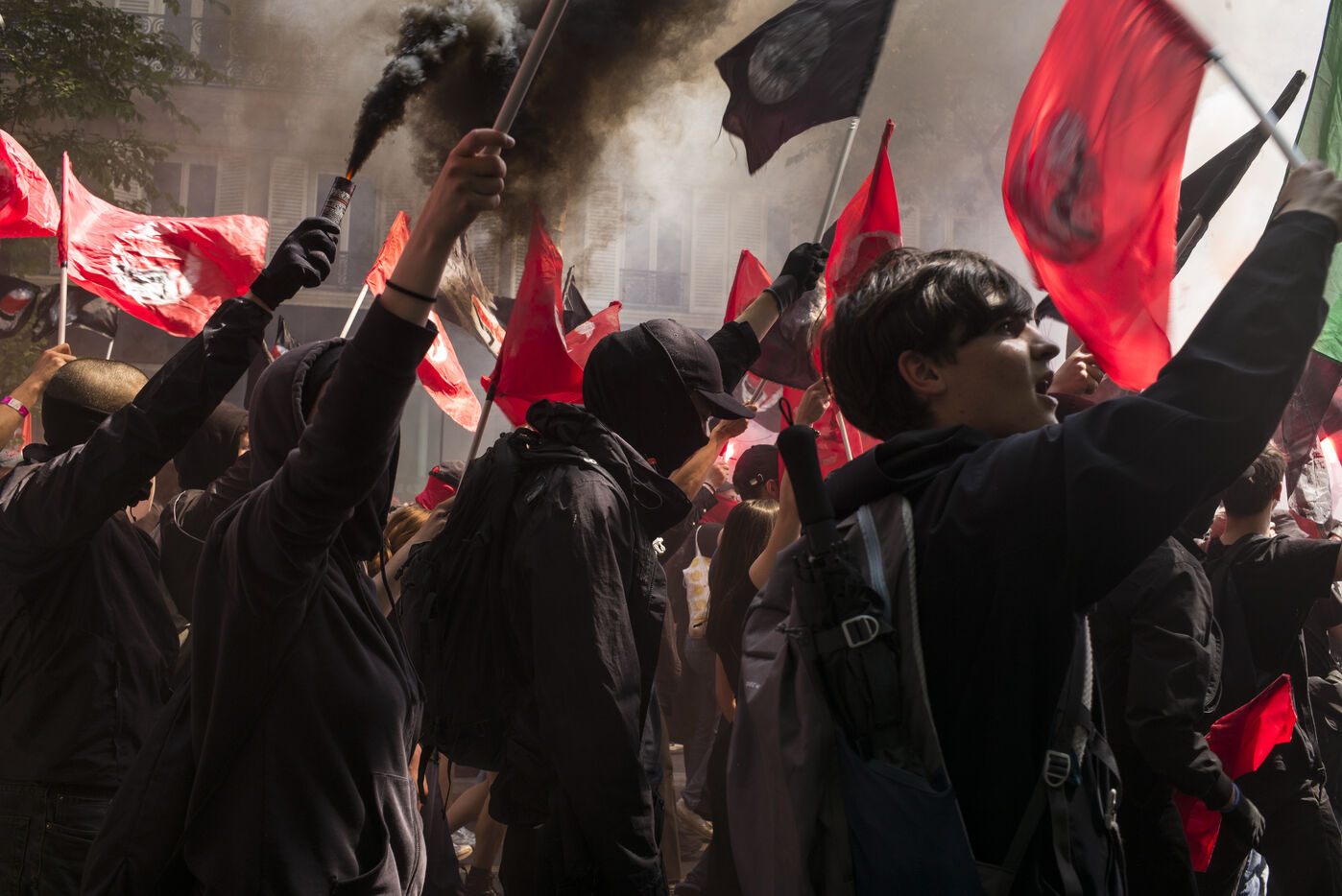Manifestation à Barbes Rochechouart antifasciste pour le dixième anniversaire du meurtre de Clement Méric, militant antifasciste de 18 ans, par des skinheads