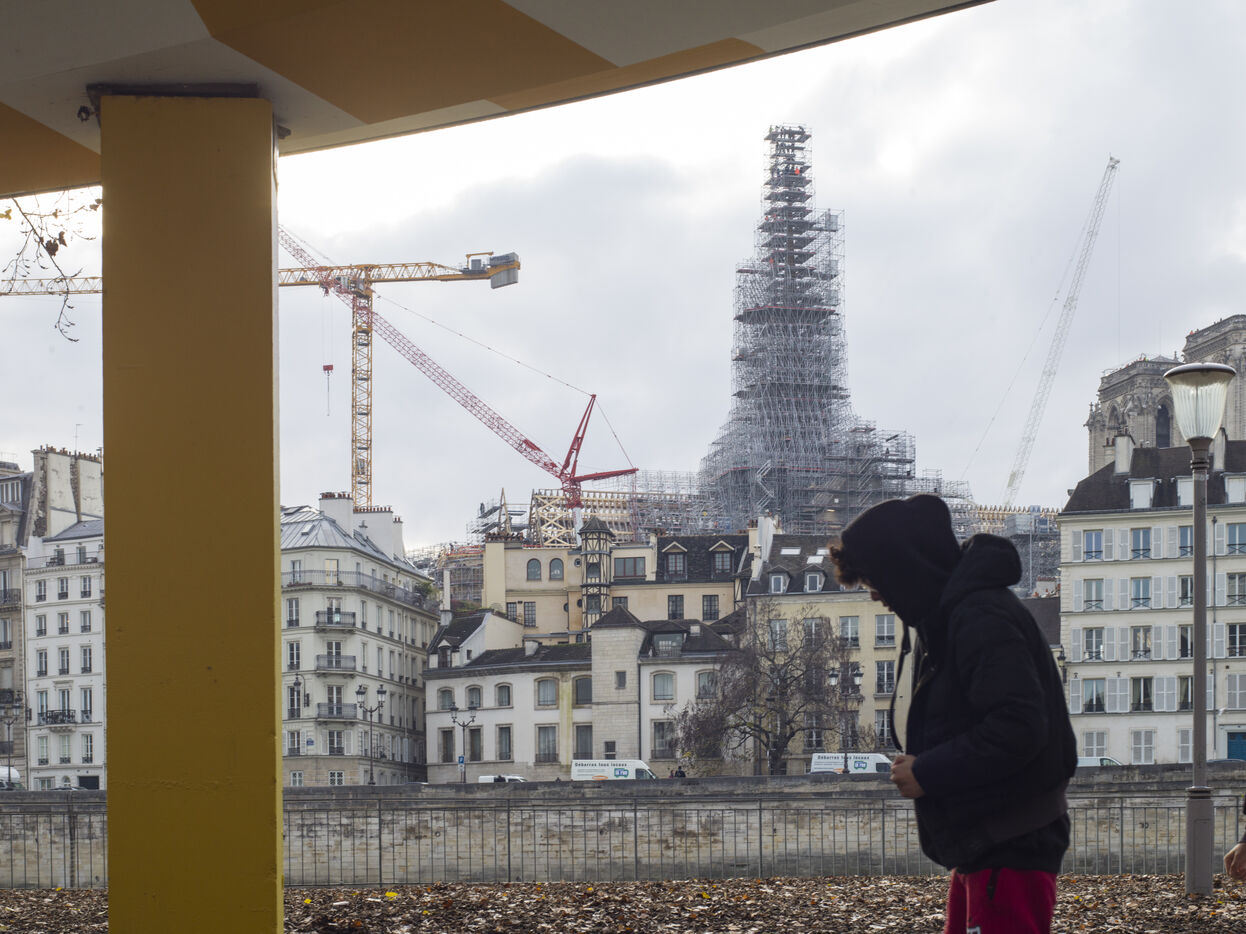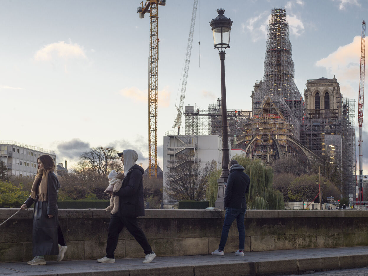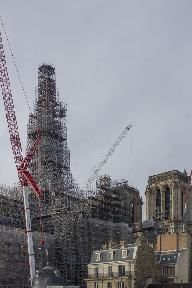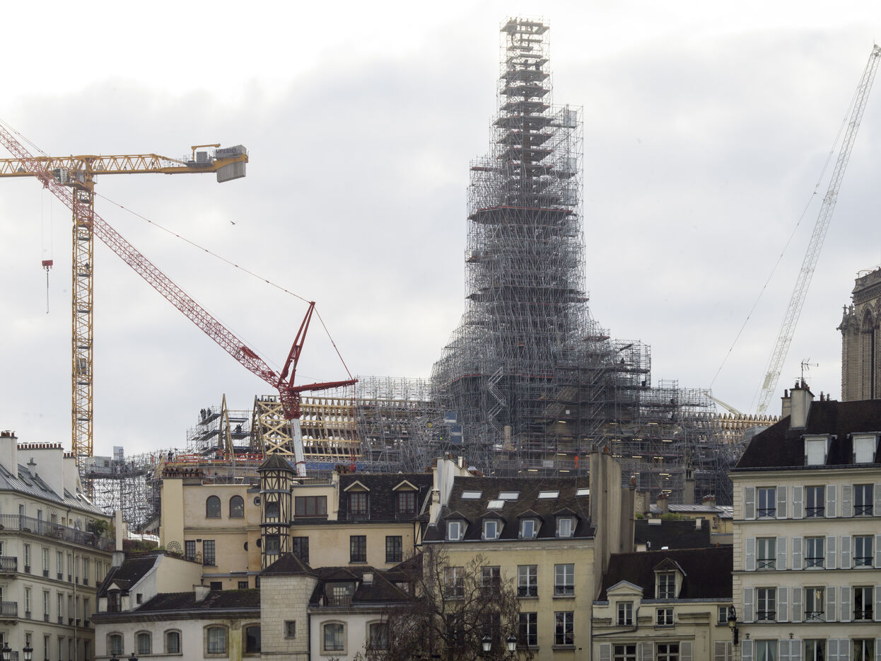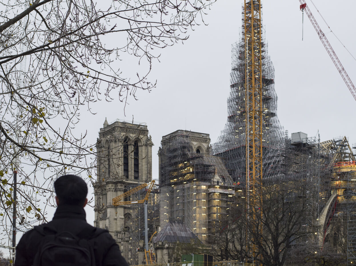Four and a half years after the fire at Notre-Dame Cathedral and a year before its reopening, the silhouette of the spire can once again be seen through the scaffolding.