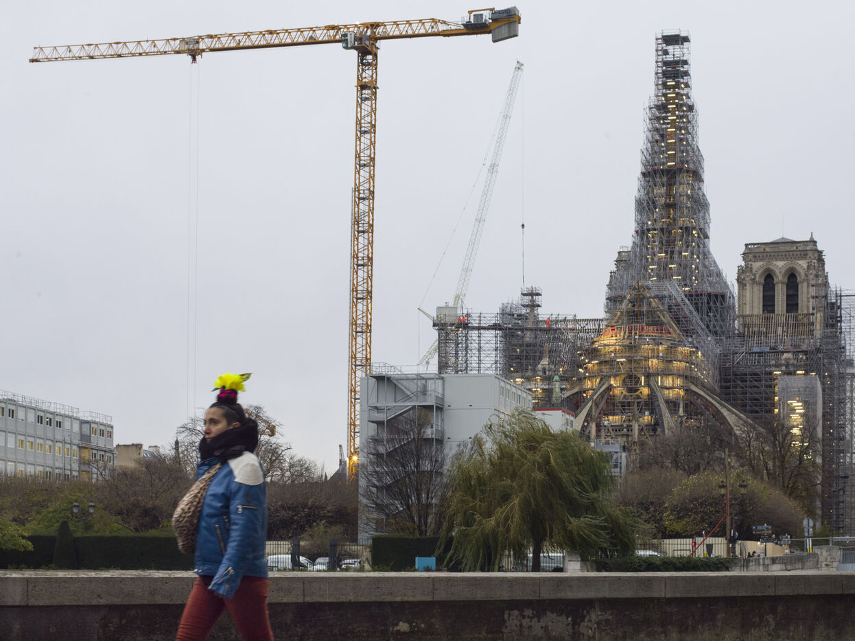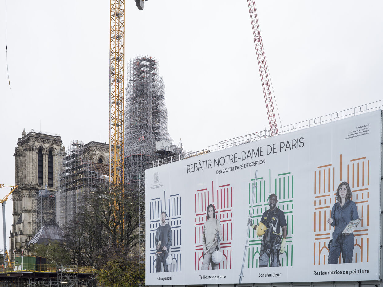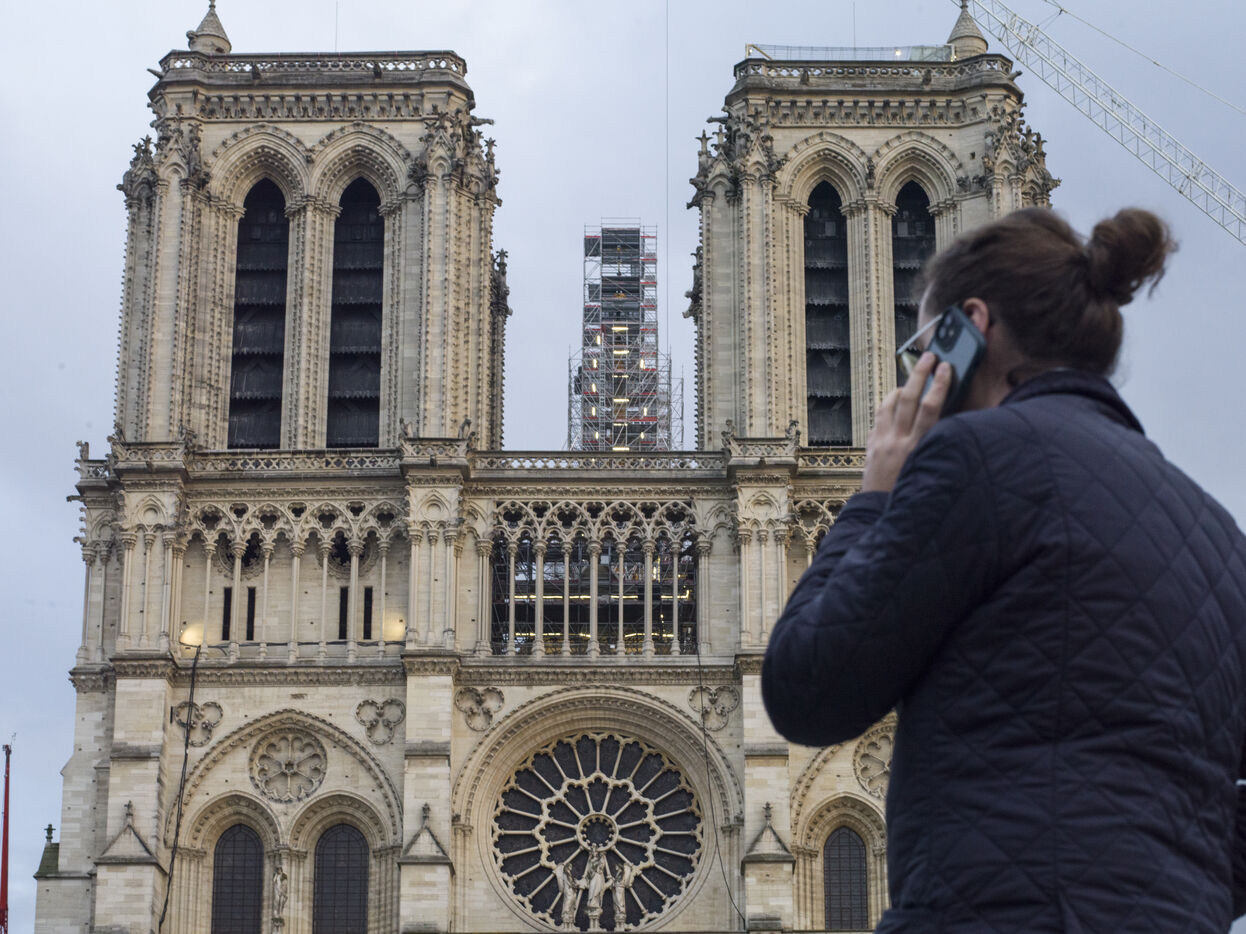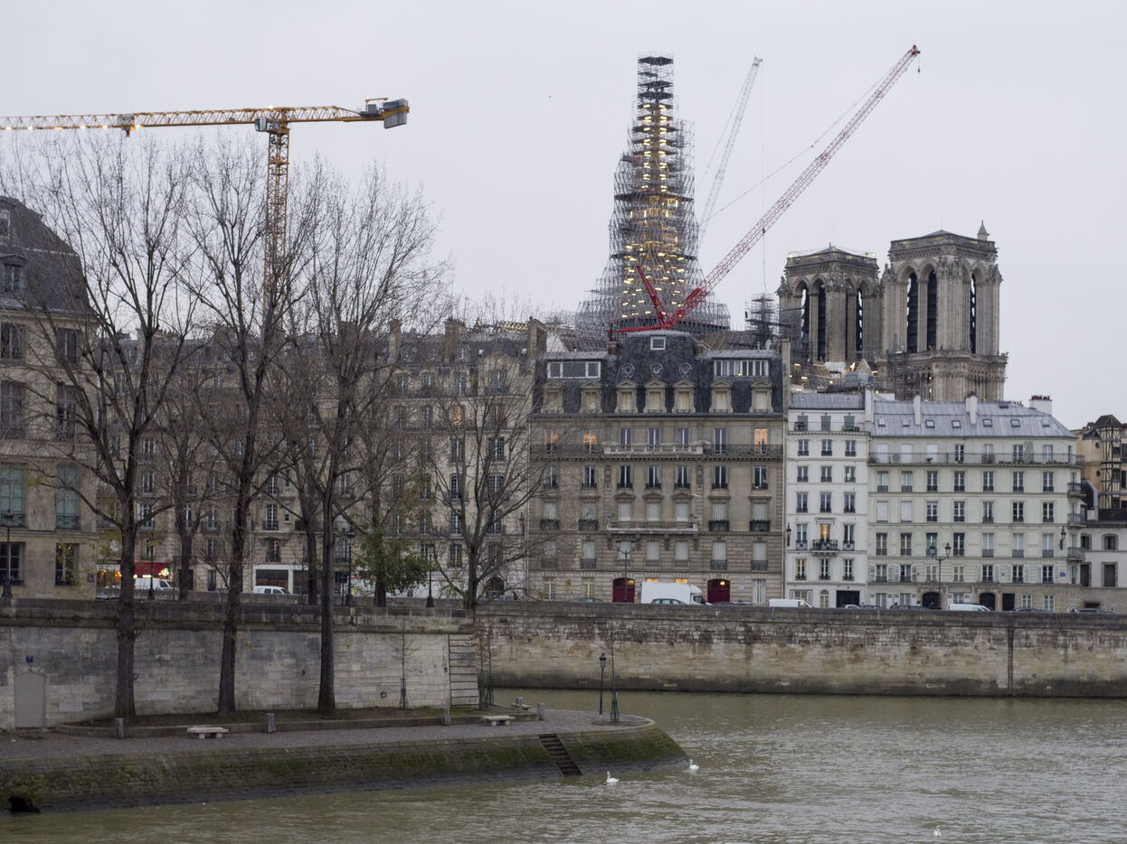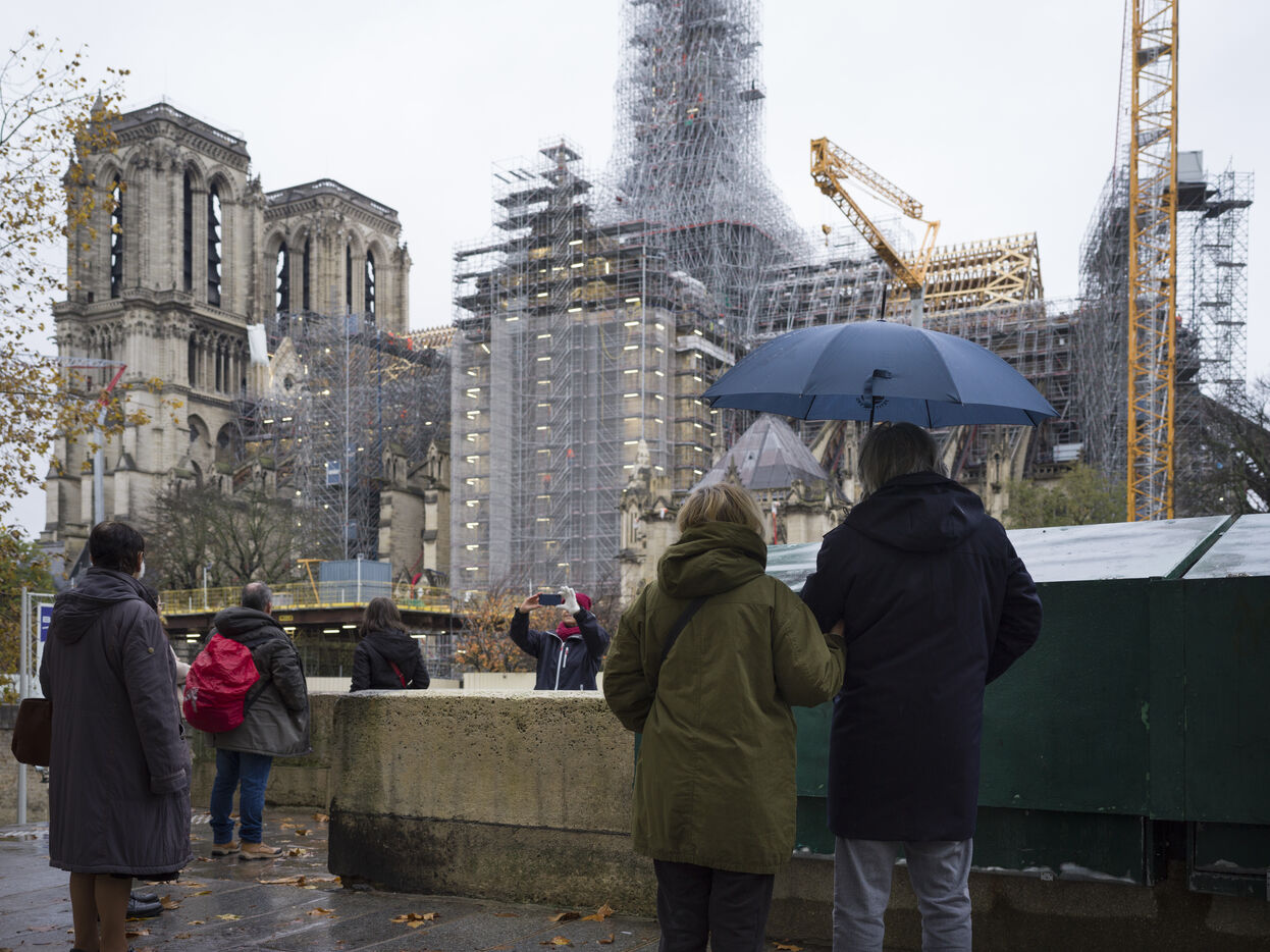 Four and a half years after the fire at Notre-Dame Cathedral and a year before its reopening, the silhouette of the spire can once again be seen through the scaffolding.