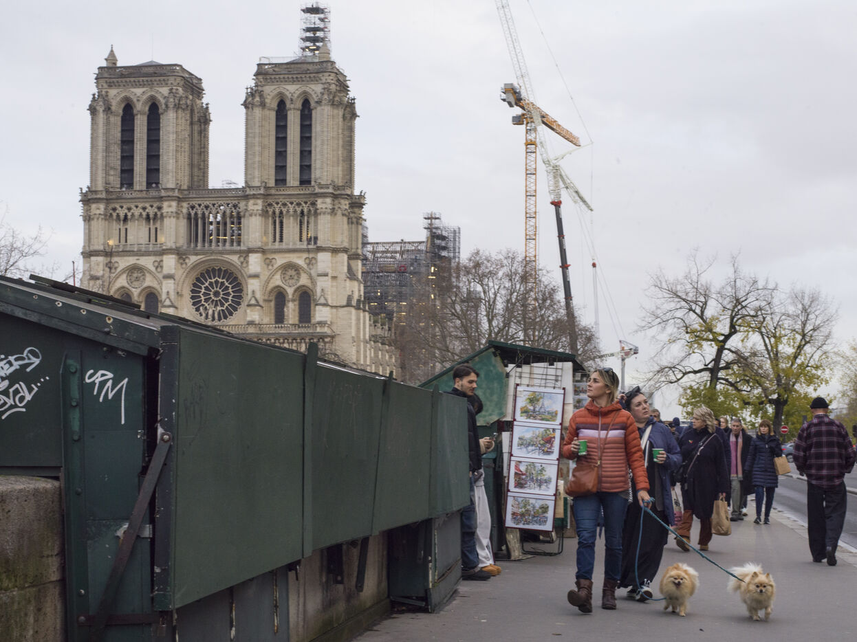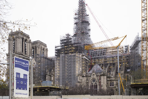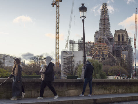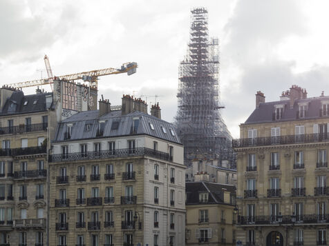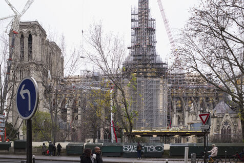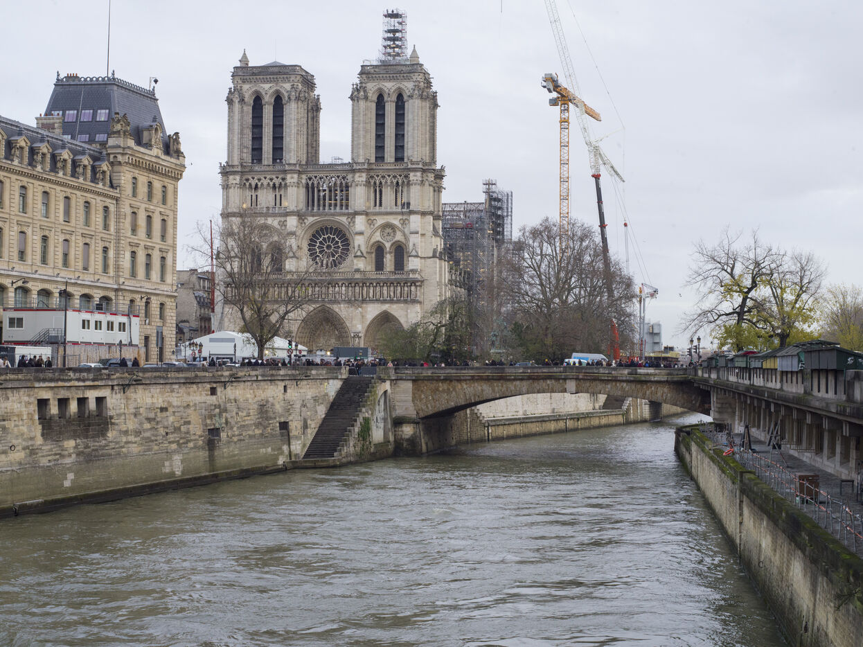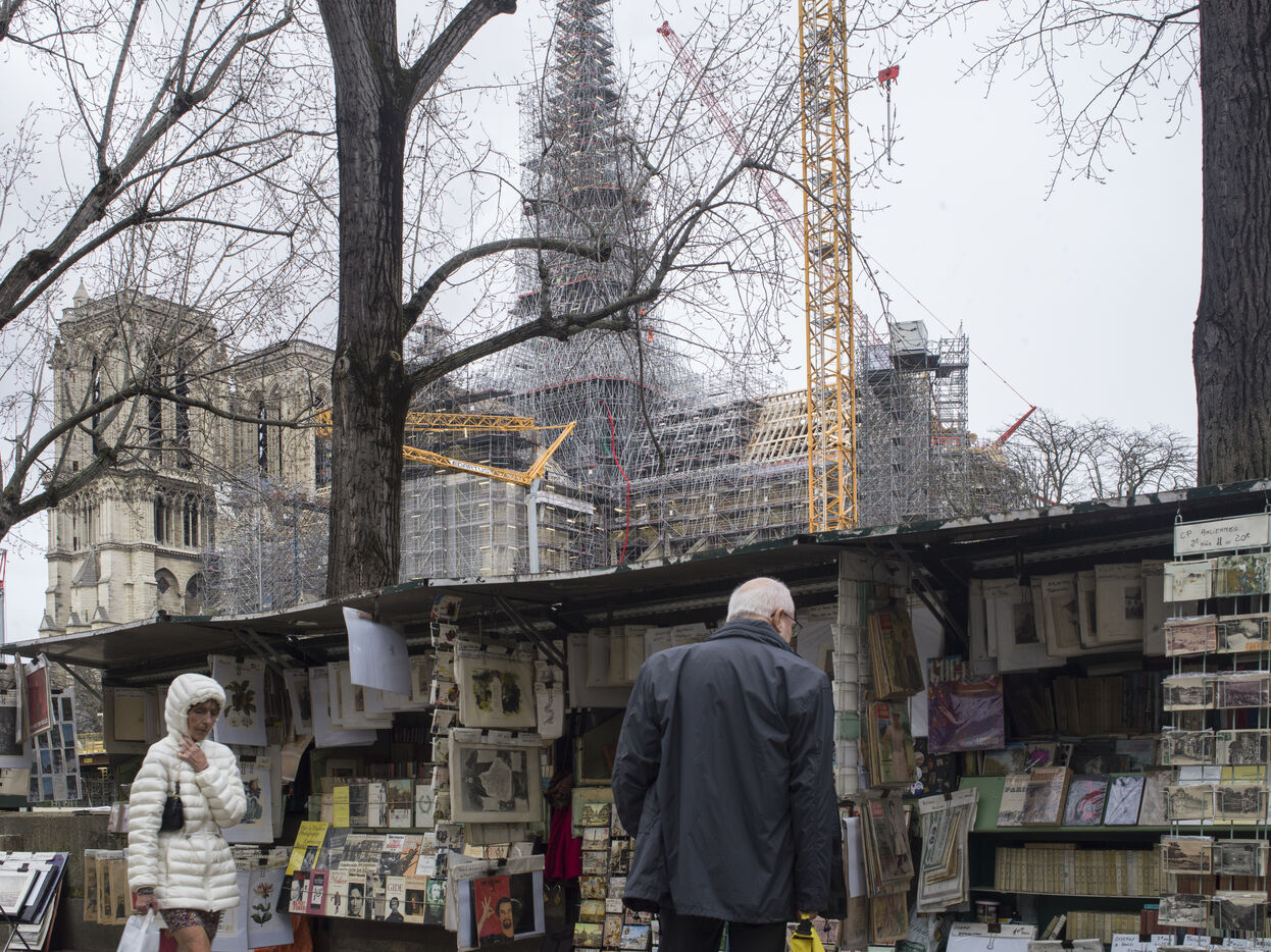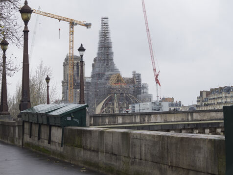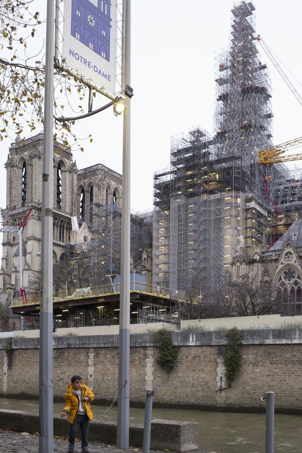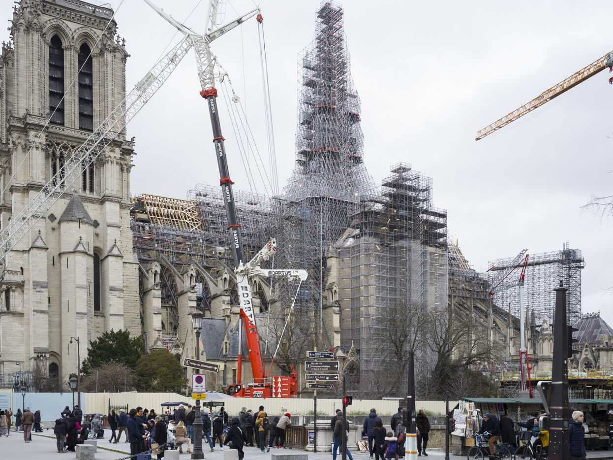 Four and a half years after the fire at Notre-Dame Cathedral and a year before its reopening, the silhouette of the spire can once again be seen through the scaffolding.