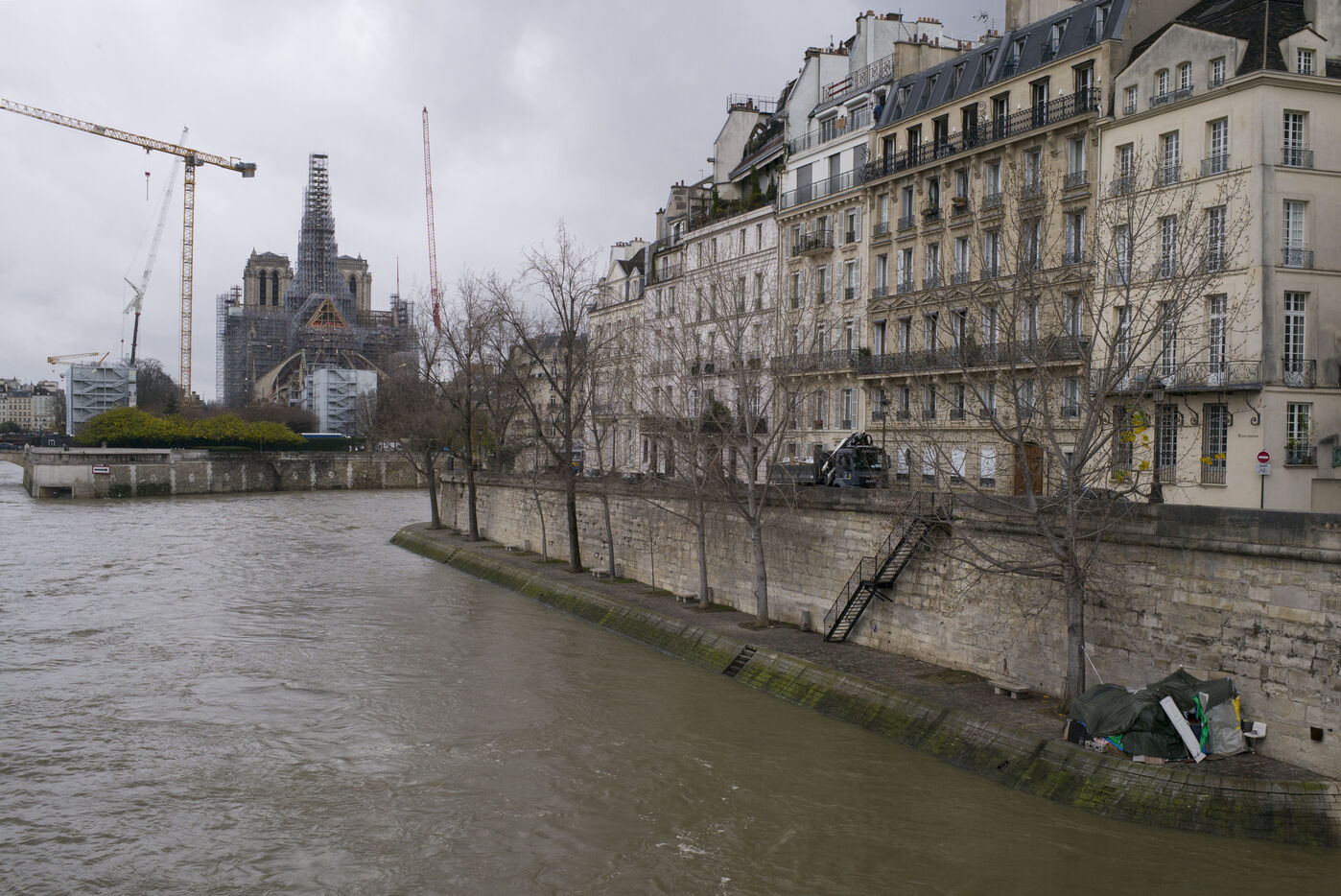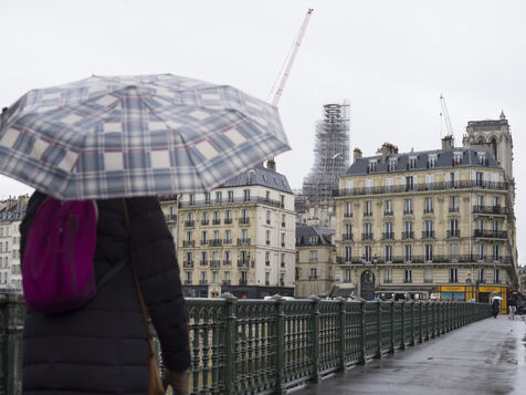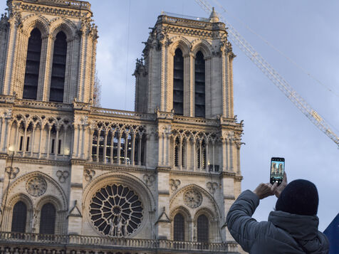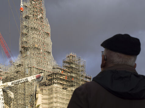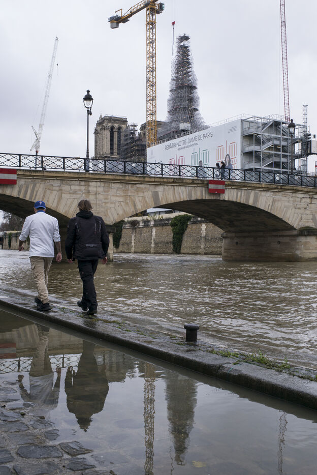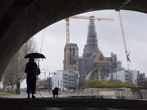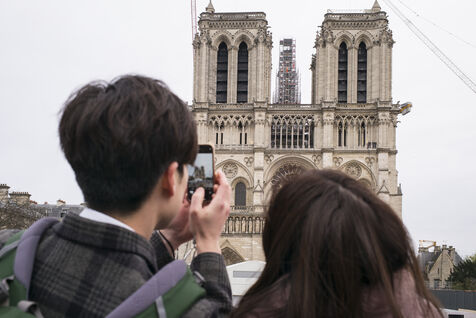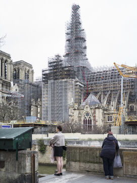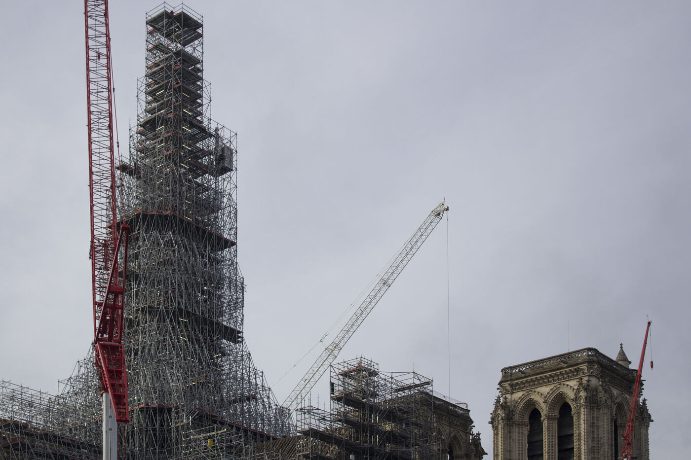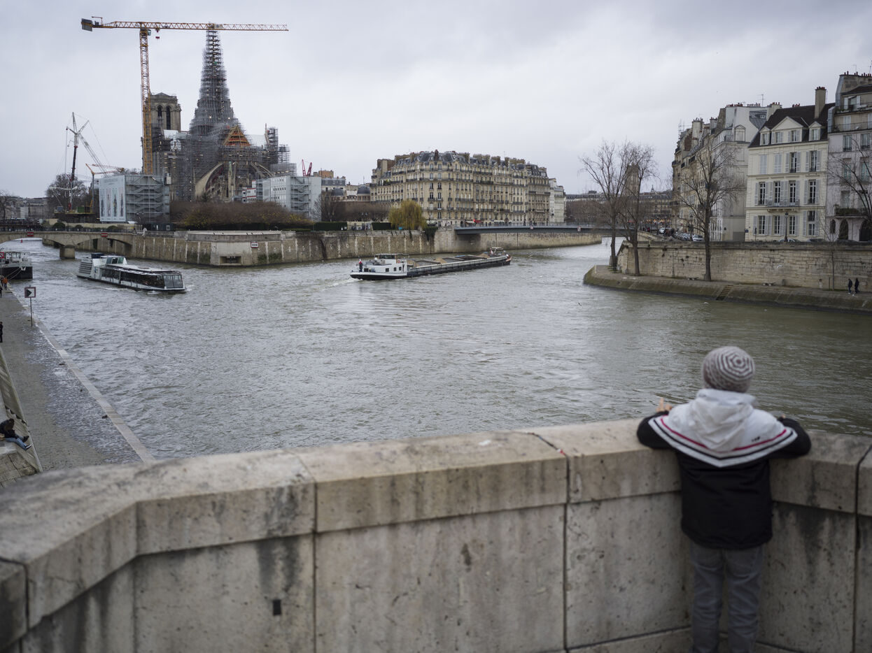 Four and a half years after the fire at Notre-Dame Cathedral and a year before its reopening, the silhouette of the spire can once again be seen through the scaffolding.