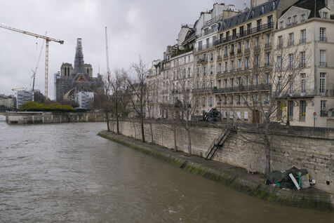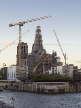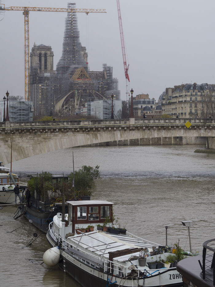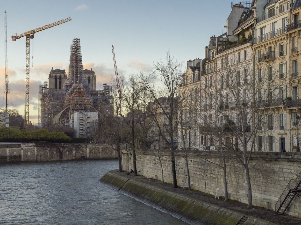 Quatre ans et demi après l'incendie de la cathédrale Notre-Dame et un an avant sa réouverture, on distingue à nouveau la silhouette de la flèche à travers les échafaudages.