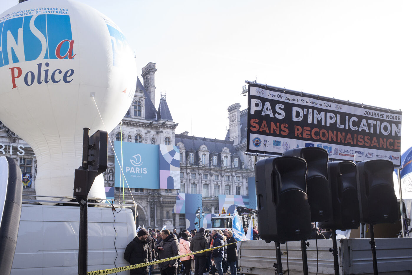 A l'approche des Jeux olympiques, des centaines de policiers ont manifestés sur la place de l'Hotel de ville de Paris pour protester contre les conditions de leur mobilisation pendant les jeux . Ils réclament des primes, une aide pour les gardes d'enfants, des garanties sur les congés d?été.