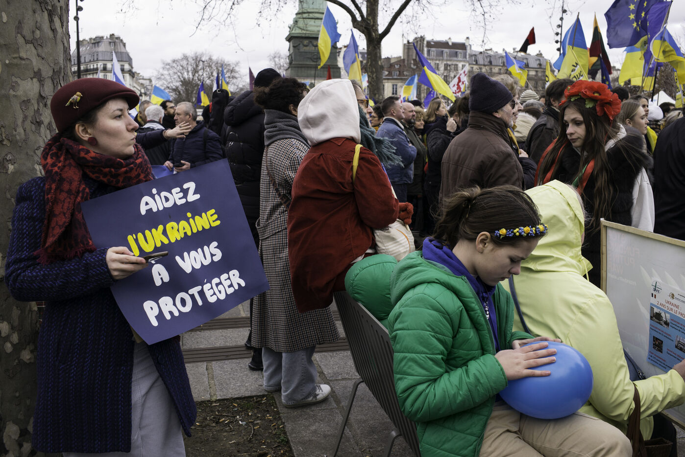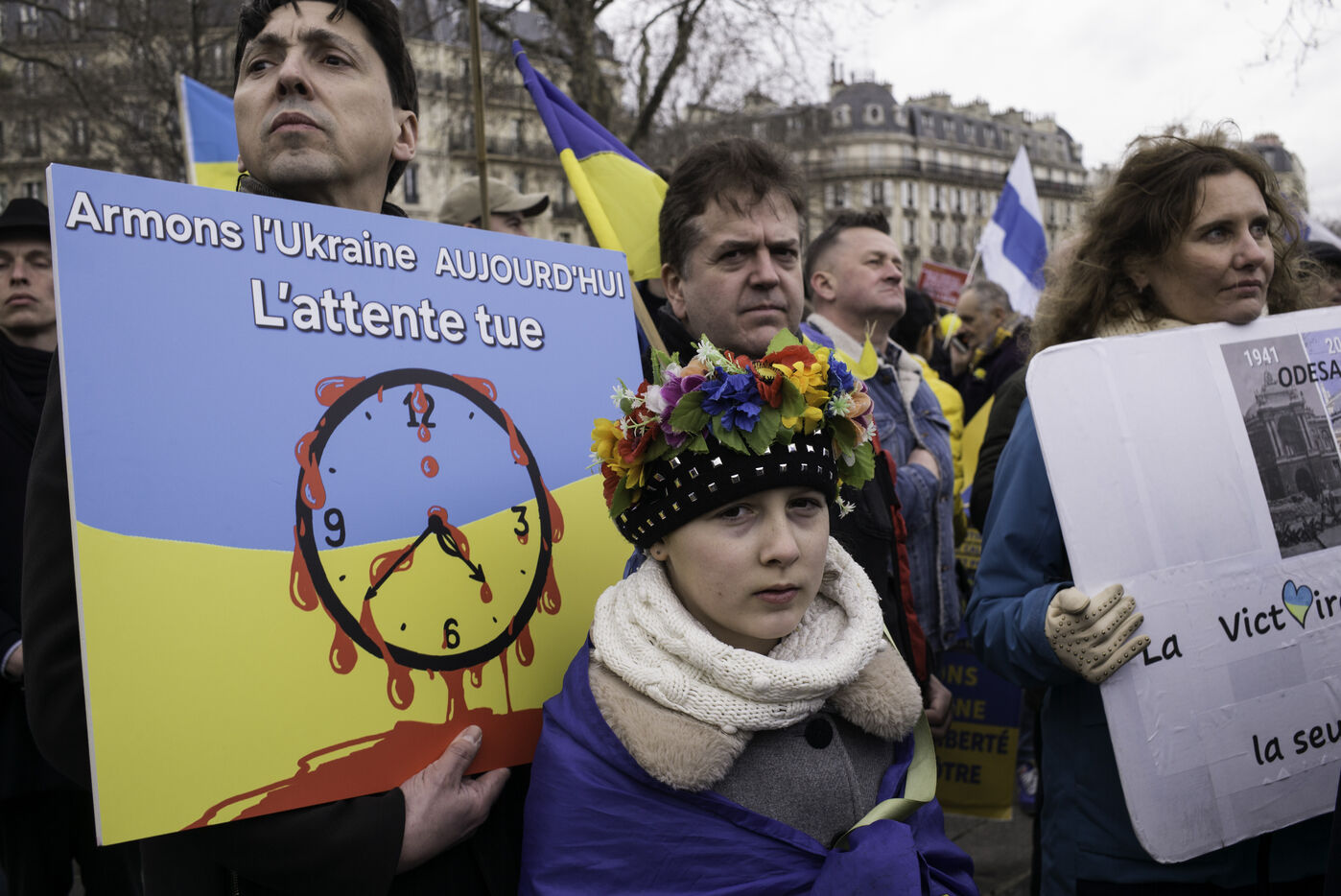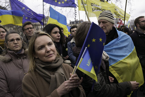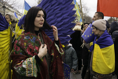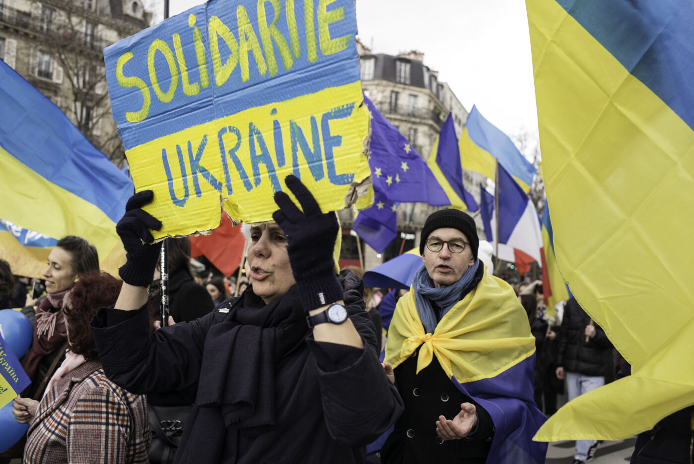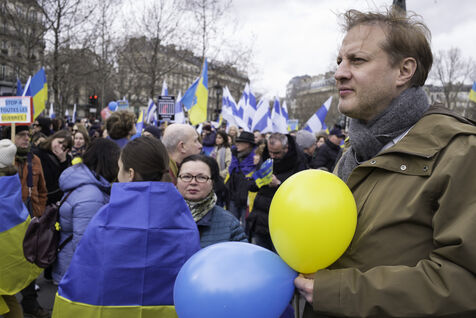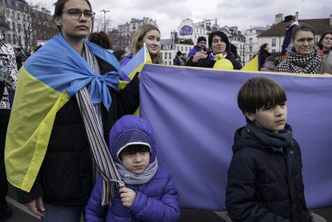 France, Paris, 2024-02-14. For 2 years, Russia has been waging a criminal war in Ukraine. On 24 February, a march through Paris was organised to show solidarity with the Ukrainian people and to denounce the atrocious crimes against humanity committed by Putin and his army. Photograph by Eric Broncard/Hans Lucas.