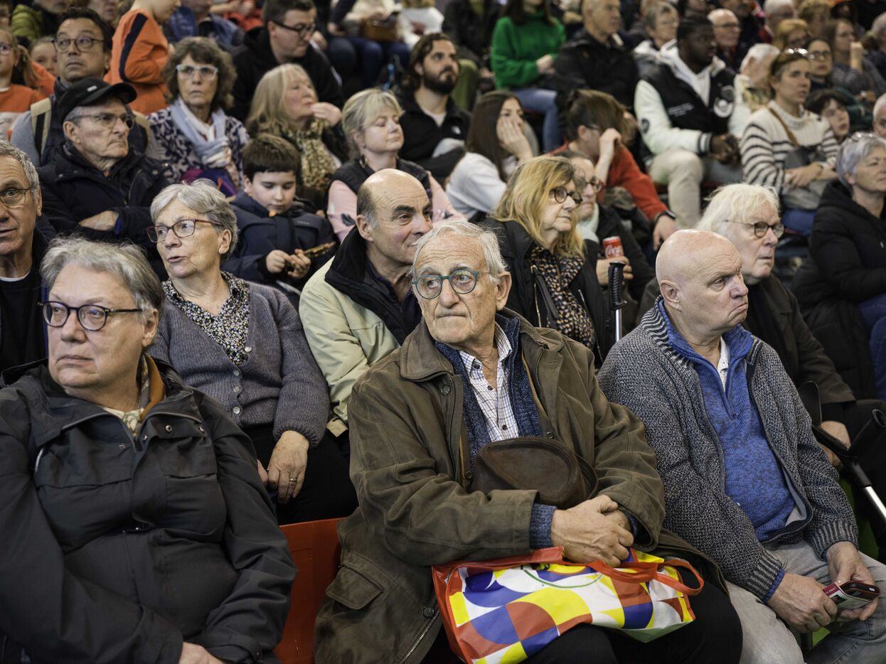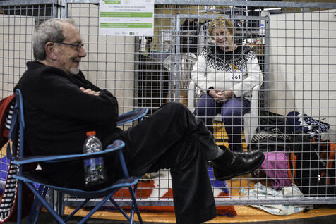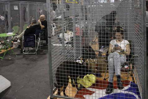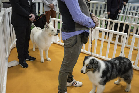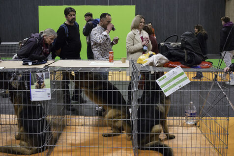 At the Salon de l'Agriculture, many dogs are brushed and combed before going before the jury. The others wait their turn, locked in cages with their owners.