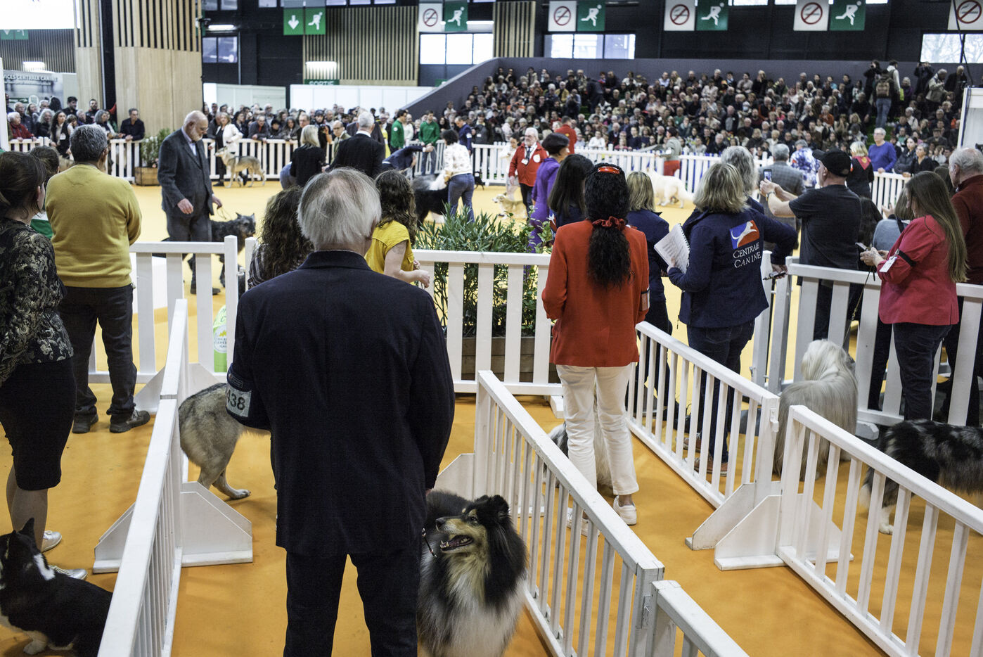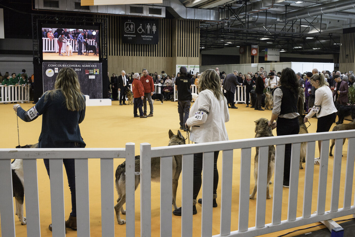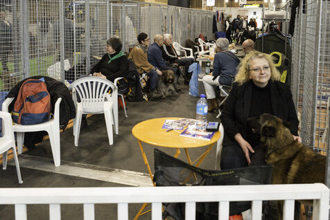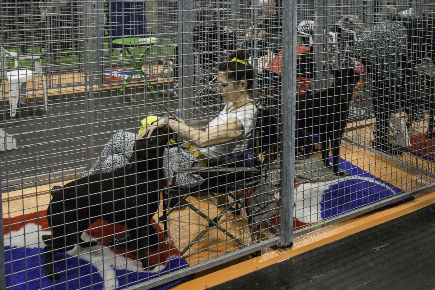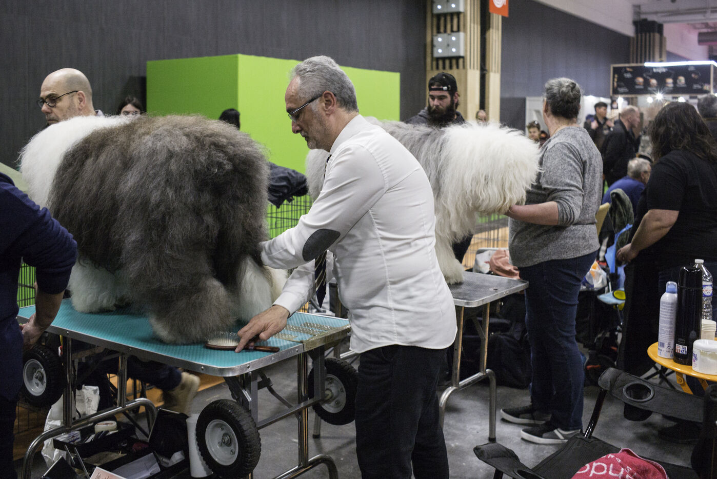 Au Salon de l'Agriculture, de nombreuses chiens se font brosser et peigner avant de passer devant le jury. Les autres attendent leur tour enfermés dans des cages avec leur propriétaire.