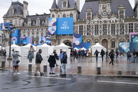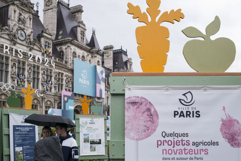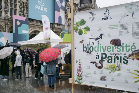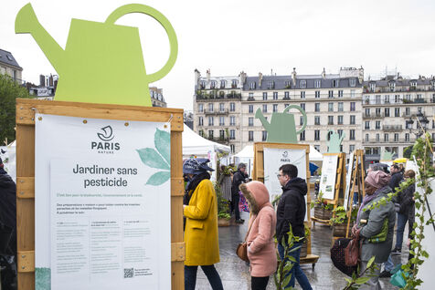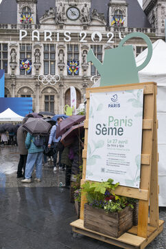Paris fête le printemps sur la place de l'Hotel de Ville sous la pluie. La ville de Paris distribue des sachets de graines et des semis de plantes locales aux parisiennes et Parisiens désireux de contribuer à la végétalisation de la Ville et d?agir pour la biodiversité de la capitale.