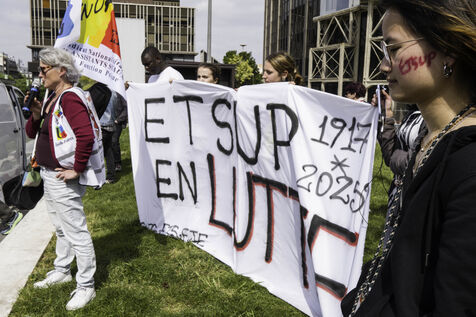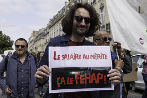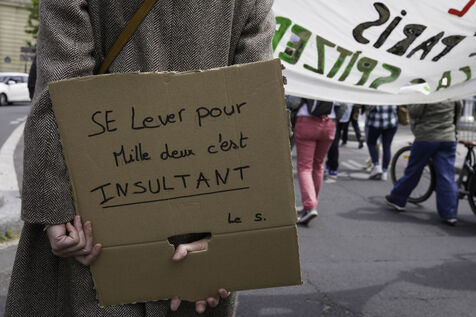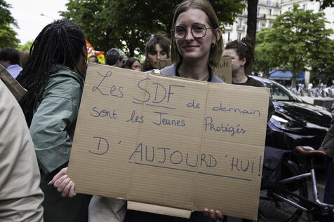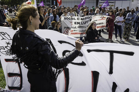 e jeune femme porte une pancarte avec le texte «Moins d’écoles, plus de galères, c’est ça la France Solidaire». Les travailleurs du secteur social et médico- social appellent à une gréve pour une hausse des salaires, de meilleurs conditions de travail et une meilleur valorisations des diplômes et des formations. Une manifestation au depart de l’Esplanade des Invalides doit se diriger vers l’ETSUP au pied de la tour Montparnasse.