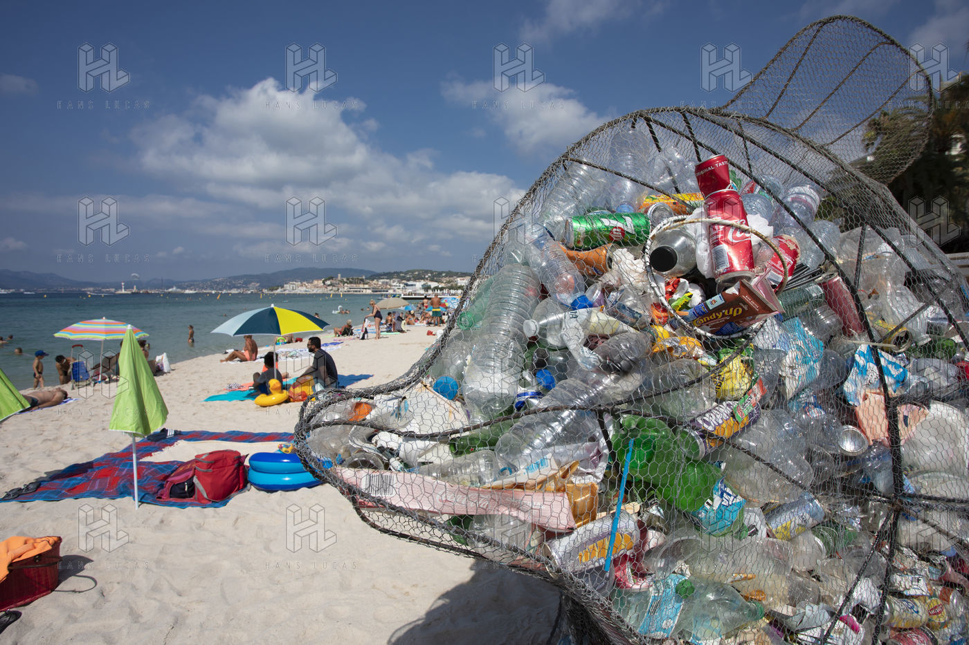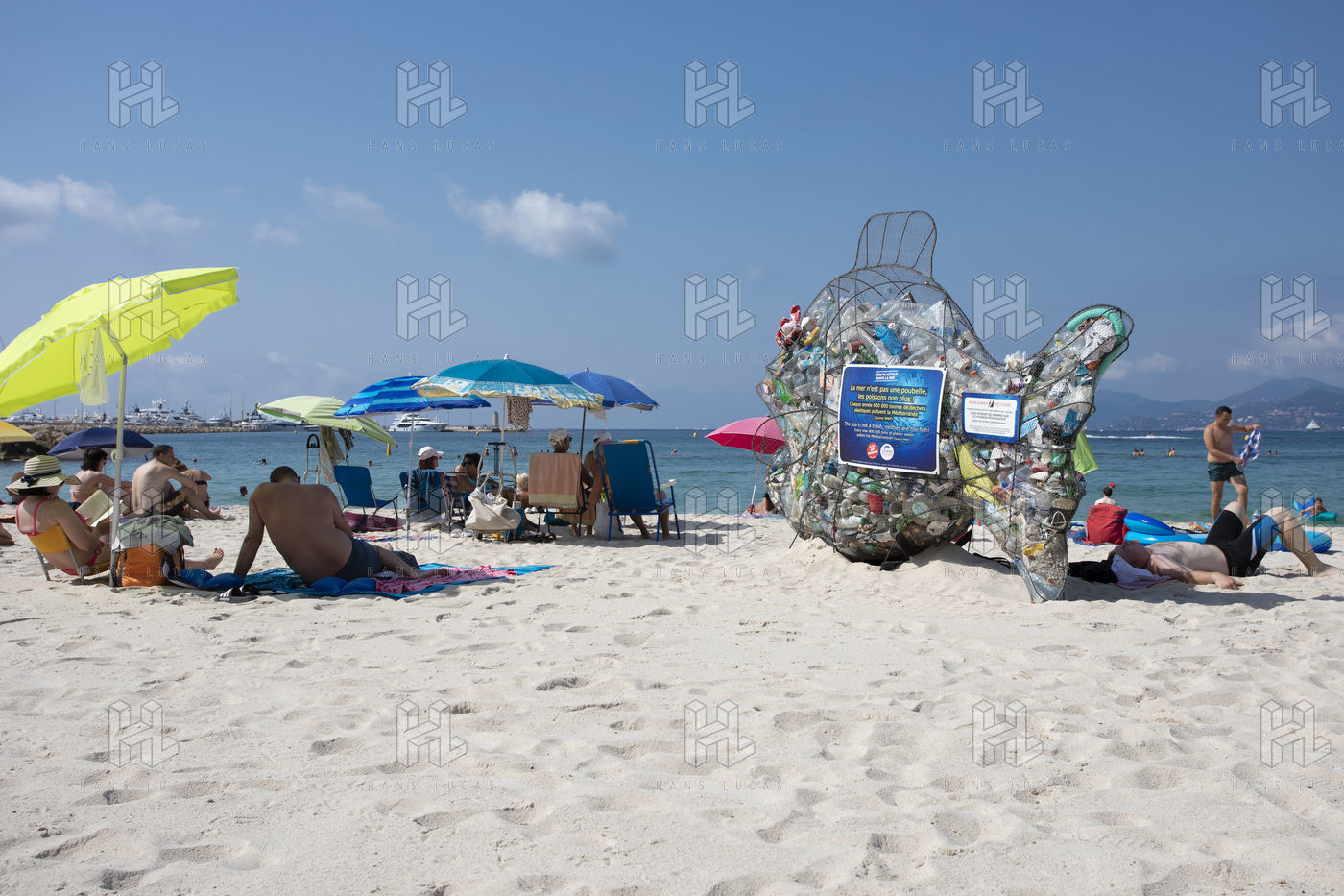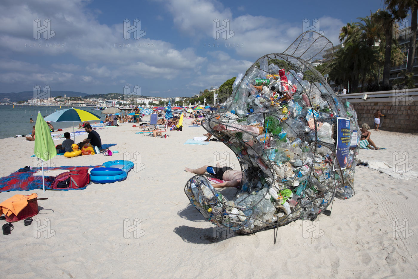 Educational fish installed on a public beach on the Croisette. This metallic fish is filled with 2.5 m3 of waste found during a sea bed clean-up operation on the beaches of the Cannes coastline. It allows to call the swimmers on the necessity not to take the sea for a dustbin.