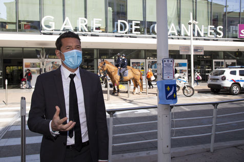 Le Maire (LR) de Cannes David Lisnard présente l installation de bouton d appels d urgence sur l espace public, devant la gare, pour protéger la population et les visiteurs. Ces boutons alarme sont directement reliés au Centre de Protection Urbain et complète le Plan Communal de Prévention du Risque Terroriste.