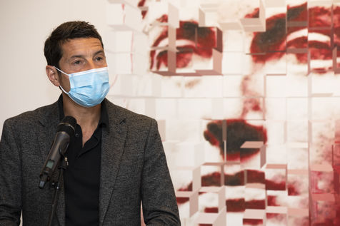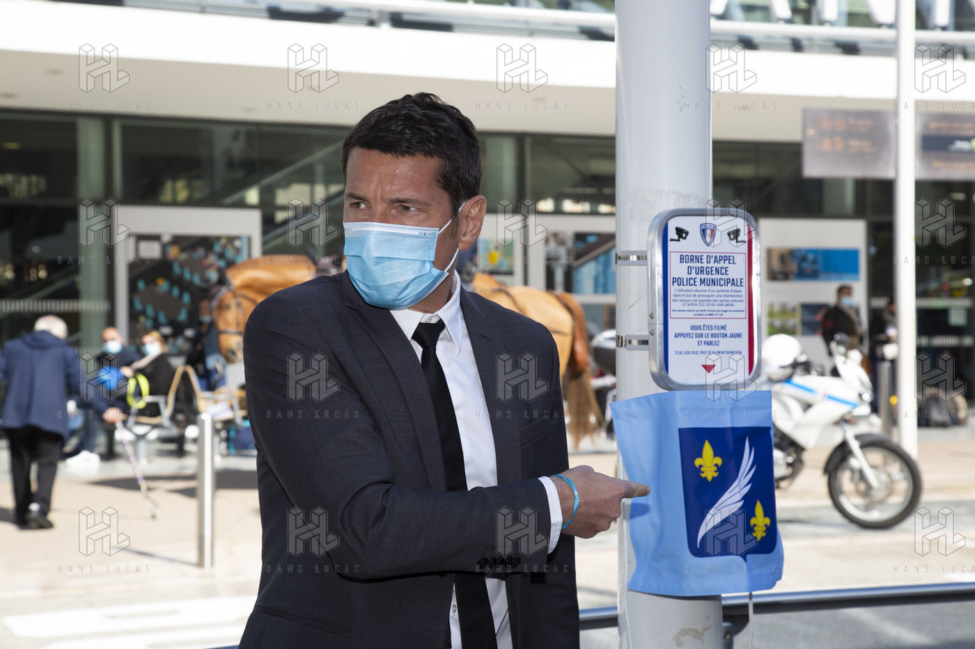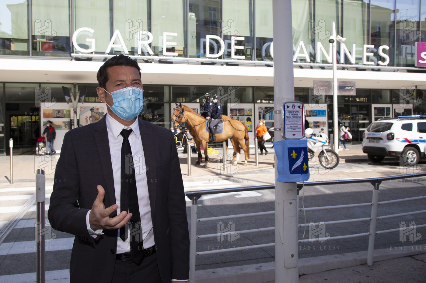 The Mayor (LR) of Cannes David Lisnard presents the installation of an emergency call button in the public space, in front of the station, to protect the population and visitors. These alarm buttons are directly linked to the Urban Protection Center and complete the Communal Plan for the Prevention of Terrorist Risks.