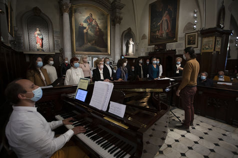 Les croyants assistent à la messe de Paques dans l église Notre Dame d Esperance pendant la crise sanitaire du coronavirus (COVID-19). Un banc sur deux est interdit d'accès pour que les fidèles respectent la distanciation sociale.