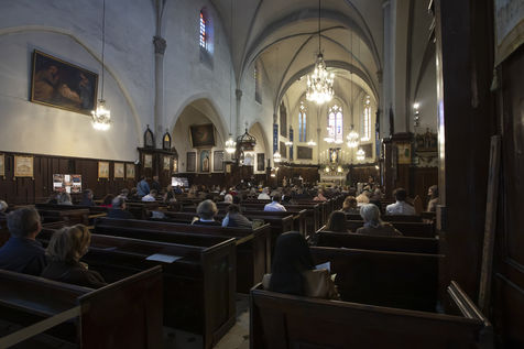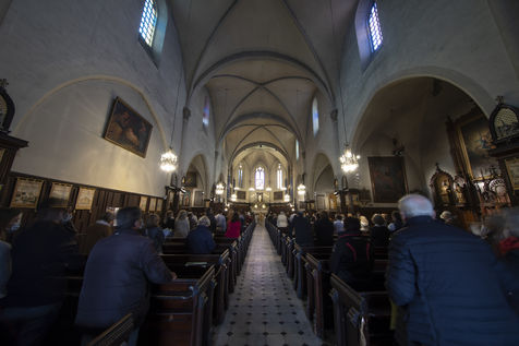 Believers attend Easter Mass in Notre Dame d'Esperance Church during the coronavirus (COVID-19) health crisis. One in two benches is forbidden to access so that the faithful respect social distancing.