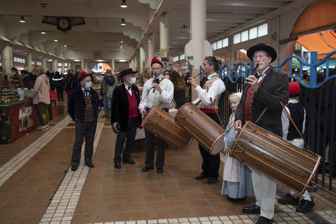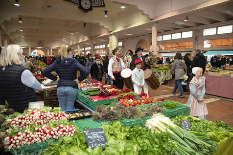 Vue du marché Forville pendant la crise sanitaire. Un groupe folklorique joue de la musique provençal dans les allées du marché.