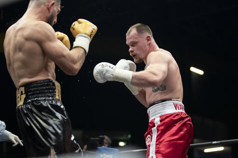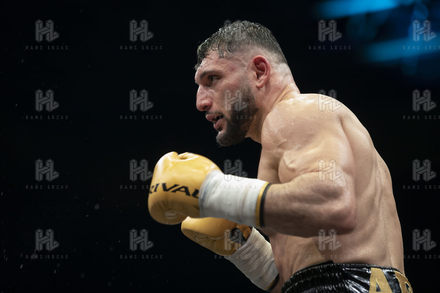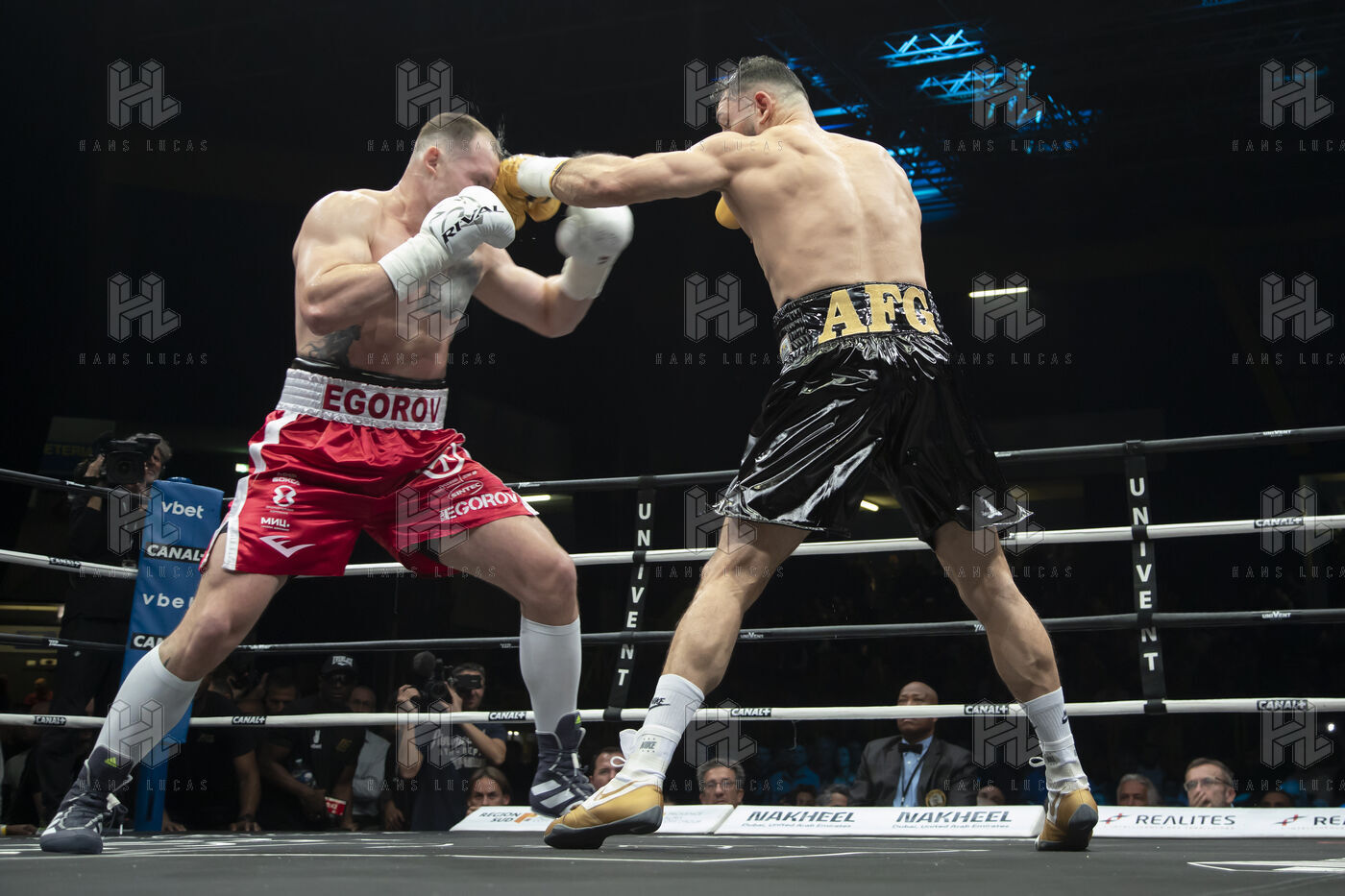 Le champion du monde français d origine armenienne Arsen Goulamirian affronte le boxeur russe Alexei Egorov lors du championnat du monde WBA des lourds-légers.