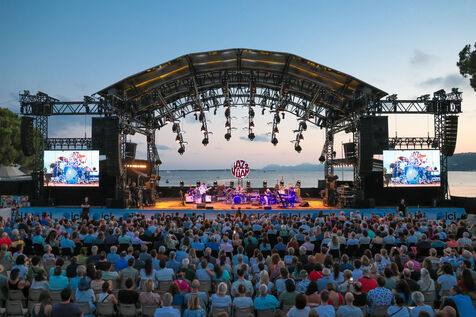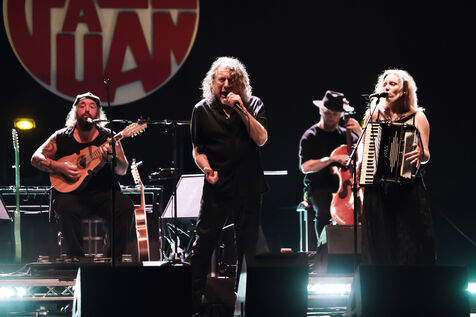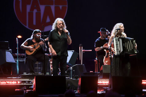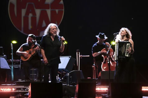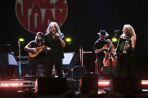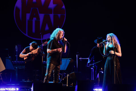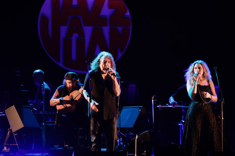 Robert Plant se produit avec son groupe Saving Grace et Suzi Dian sur la scène du festival Jazz à Juan 2025.