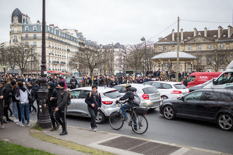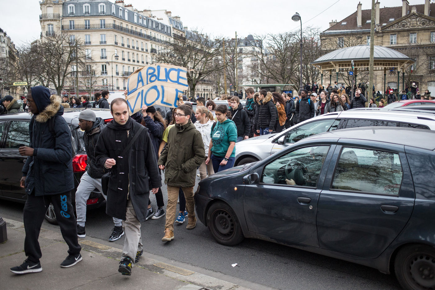 Paris, France, February 23 2017. High school students gather during a demonstration at place de la Nation in tribute to Theo Luhaka, a young man seriously wounded and allegedly raped during a police control in Aulnay sous bois northern Paris.