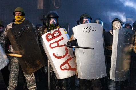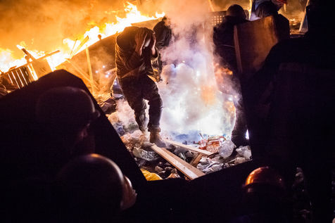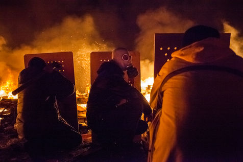 Février 2014, Kiev - Ukraine. La Place de l'indépendance à Kiev est le symbole du mouvement de contestation communément appelé « Le Maïdan ». Le 21 novembre 2013, le refus du gouvernement du président Ianoukovytch de ratifier l'accord d'association avec l'Union Européenne au profit de son voisin Russe, entraîne des manifestations de l'opposition pro-européenne sur la place de l'indépendance. Alors que l'insatisfaction gagne la population, les manifestants affluent de tout le pays. Des tentes et barricades sont installées quelques jours plus tard pour protéger les manifestants de la répression policière de plus en plus violente. Trois mois plus tard, la place ne désemplit pas alors que le rapprochement du président Ianoukovitch et de son allié russe est de plus en plus flagrant. Face aux tentatives de faire taire les manifestants par le vote de lois sanctionnant les rassemblements et les arrestations sommaires, le mouvement se renforce. Dès lors, la lutte se propage et les manifestants dénoncent maintenant leurs privations de libertés d'expression, le glissement vers la dictature et l'ingérence du pouvoir russe. Le 18 février 2014, les forces spéciales anti-émeute lancent l'assaut final sur la place où sont désormais rassemblés plus de 20 000 manifestants. Dans un dernier acte de résistance, ces derniers montent un mur de feu pour empêcher l'avancée des forces de l'ordre bien mieux équipées. Cernés de toute part, les insurgés tiendront bravement la place durant la nuit, au prix de nombreux morts et blessés. Les images suivantes couvrent la période du 18 au 22 février durant cette lutte acharnée entre la police et les manifestants. Cet événement marquera la destitution du président Ianoukovytch qui sera contraint de quitter le pays.