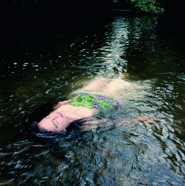 Et cette autre Narcisse en robe tout aussi blanche, les mains enfoncées dans l'humus et les lèvres peintes, entre-t-elle ou sort-elle de l'eau ? Ses yeux retournés signifient-ils qu'elle s'en tire ou qu'elle s'enfonce ? Derrière elle, un fond de branches et de nuages, jusqu'à ce que... renversement de perspective : l'oeil comprend l'effet de bascule, le décor n'est que reflet dans le fleuve.