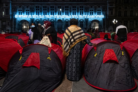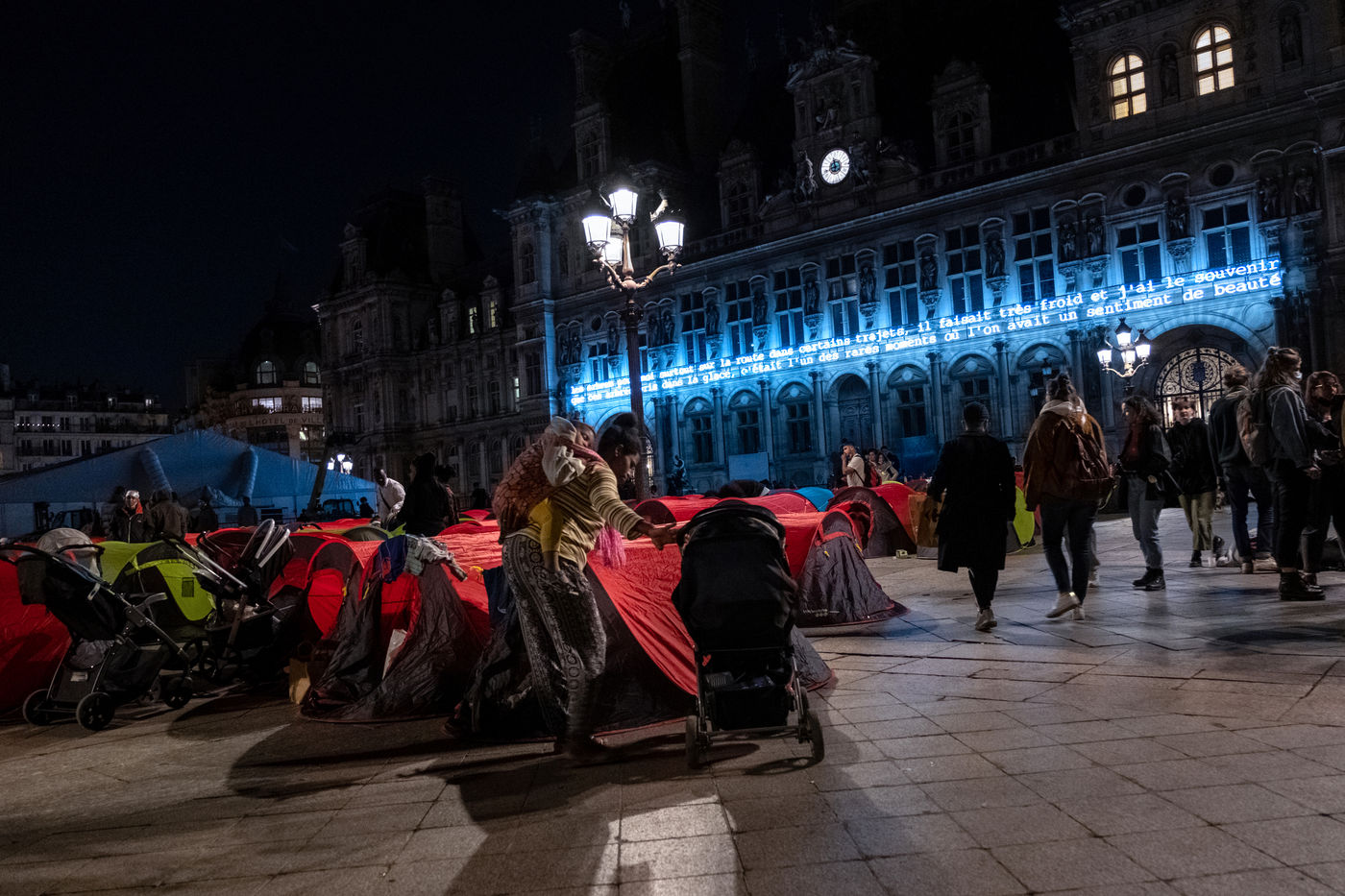 En attendant que des bus affrétés par la préfecture passent les prendre pour les conduire vers un lieu d'hébergement provisoire que sont souvent des hôtels miteux situés en bordure d'autoroutes aux confins de la région parisienne, 300 personnes se préparent à dormir une nuit de plus sous des tentes, et ce, triste ironnie, sur le parvis d'un l'Hôtel de Ville.