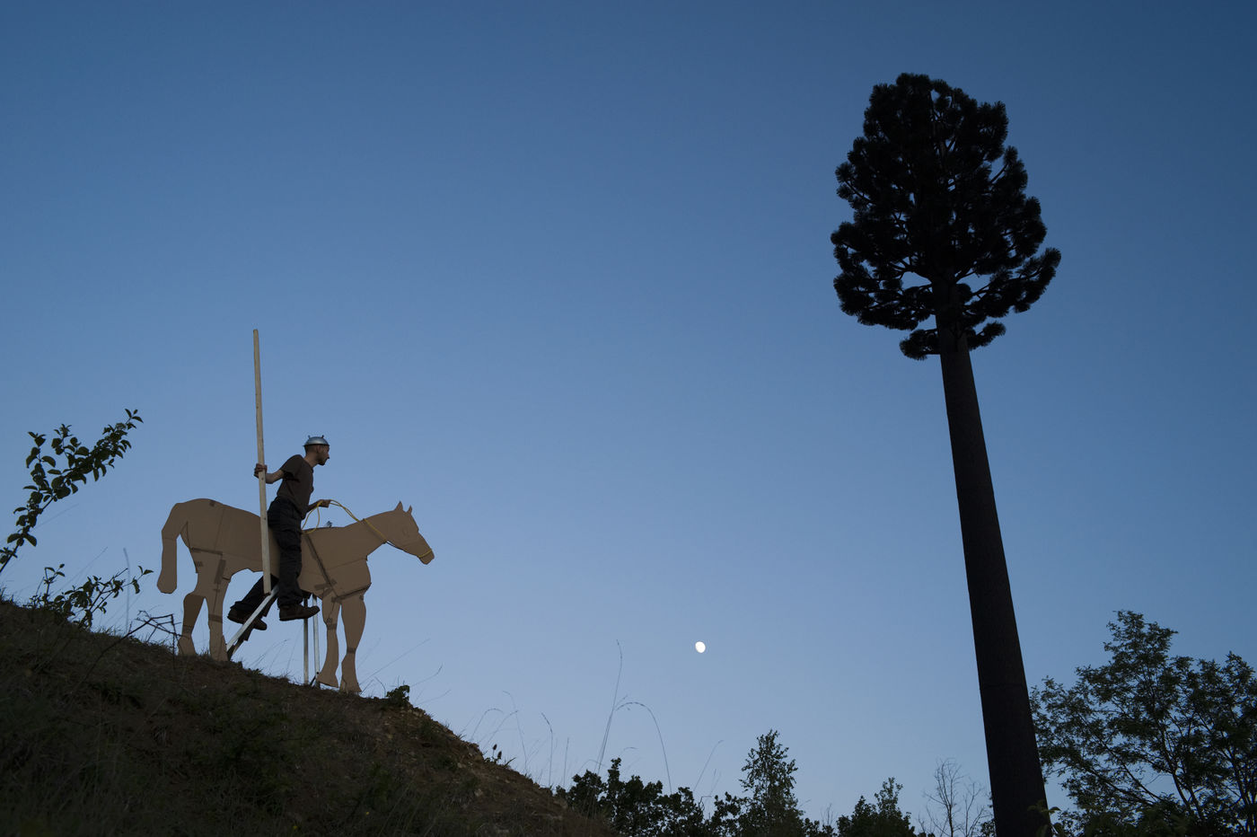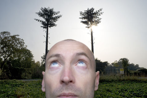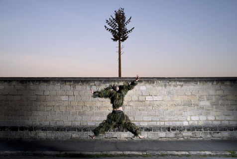 A l'origine de ce projet il y a une antenne relais de téléphonie mobile installée à une vingtaine de mètres des fenêtres de mon appartement. Bien que particulièrement soucieux de cette atteinte à mon cadre de vie, je n'arrivais que peu à mobiliser les forces nécessaires pour me joindre à la contestation des riverains; fabrication de banderoles, collecte de signatures, rencontre des élus... L'opérateur, lui, faisant la sourde oreille. J'étais cependant fortement décider à entreprendre un travail photographique sur cette nouvelle pollution, les micro-ondes pulsées. C'est en découvrant l'existence de pylônes camouflés en arbre que j'ai retrouvé l'énergie du combat. Cette relation physique au sujet s'est imposée d'elle-même lors des premières prises de vues. Me trouvant ainsi sur les pas de Don Quichotte, incarnant un personnage fantasque et va-t-en-guerre, j'ai voulu le suivre dans sa folie et son courage, naviguant entre l'imaginaire et un propos revendicatif.