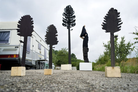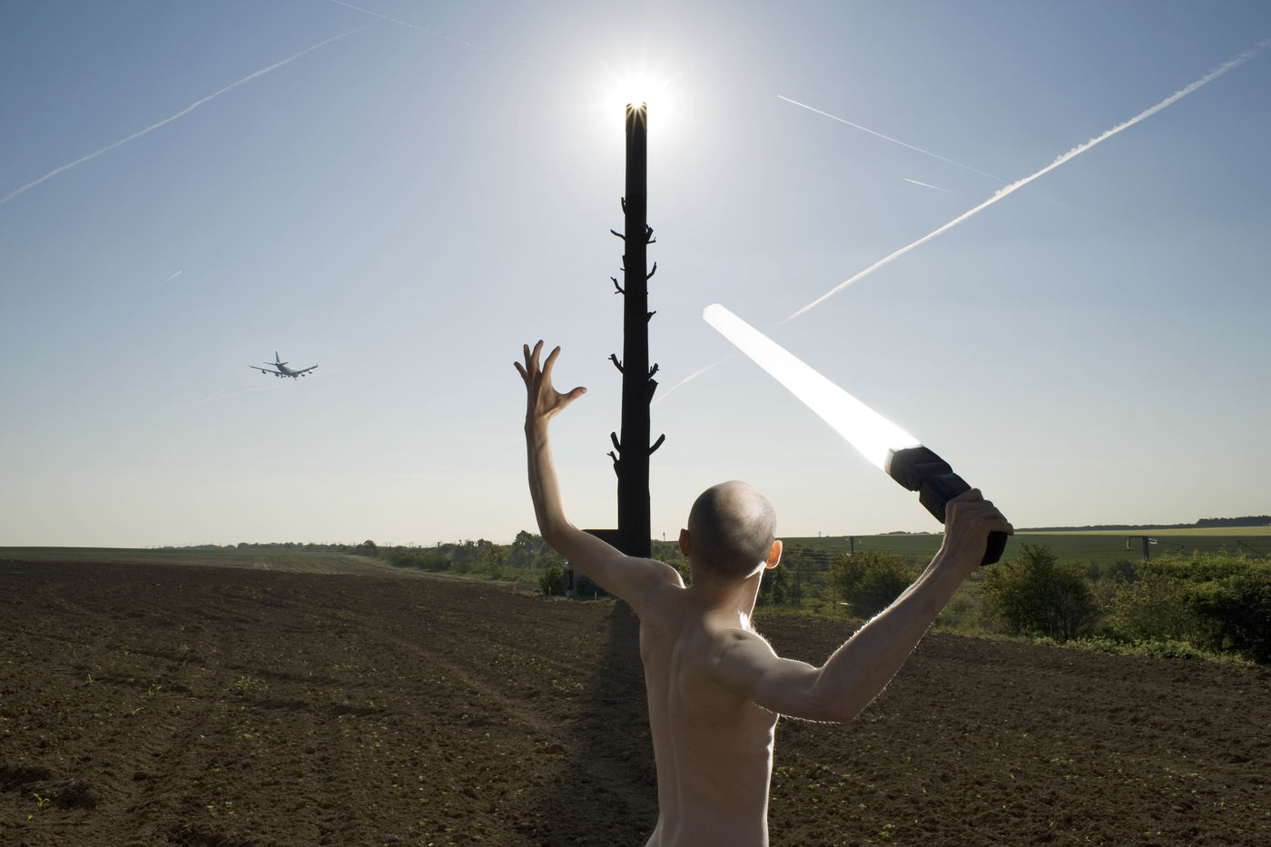 The idea behind this project grew out of the fact that a mobile phone relay antenna has been built about 20m from my apartment window. Although I am more than concerned about this infringement on my surroundings, I couldn?t quite find the necessary impetus to join in the local protests; making banners, signing petitions, meeting MPs etc. The phone company played deaf. I was however strongly motivated to produce a series of photographs on this new form of pollution, microwave transmission. When I found out about relay antennas disguised as trees I found the energy to fight. The physical relationship to my subject was obvious from the first photographs I took. I found myself following in the footsteps of Don Quichotte, playing a fantasy figure ready to fight and I wanted to follow his madness and bravery, navigating between something imaginary and a statement of protest.