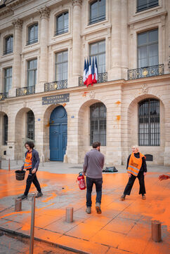 Ce lundi 1er Mai, les militants de dernière Rénovation ont repeint la façade du ministère de la justice et de l'hotel RITZ place vendôme pour dénoncer l'evasion fiscale et l'inaction climatique.
