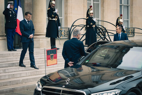 French President Emmanuel Macron welcomes German Chancellor Olaf Scholz to the Élysée Palace on January 22, 2025, for a working lunch aimed at strengthening Franco-German cooperation and promoting a strong, united Europe in the face of global challenges.