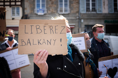 Market day in Saint-Brieuc, May 2021: occupants, actors, technicians, musicians etc... engage a strange procession with provocative slogans. This "fake right-wing demonstration" denounces the actions or positions considered as deleterious, towards the unemployed and more widely the precarious. This action is part of the movement of occupation of theaters, places of convergence of struggles, where intermittent entertainment, technicians, musicians, and other "precarious" resist the announced reform of unemployment insurance, which were to enter into force on 1 July 2021.