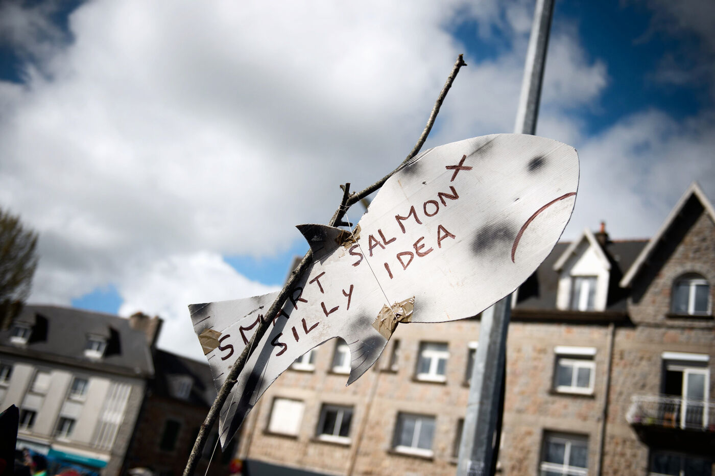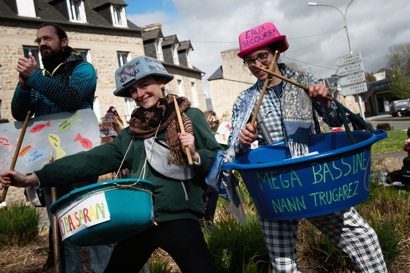 Carnaval évoquant les luttes locales : éoliennes offshore, usine à saumons, algues vertes ... mais aussi les méga-bassines de Sainte Soline.