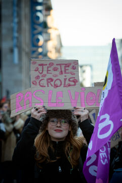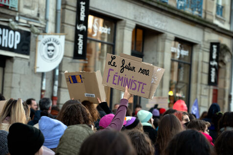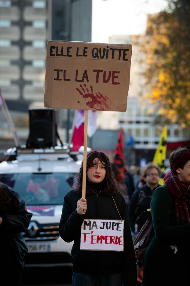 On the call of feminist inter-organisations including Nous féministes 35, Nouvelles Rênes, #NousToutes 35, Planning familial, Du pain et des roses, Solidaires 35, NPA Rennes, la France Insoumise 35, le Parti du gauche 35, FSU 35, FSE Rennes, and Puissance féministe, As part of the International Day for the Elimination of Violence against Women, 2,400 people demonstrated in Rennes to denounce the government's inertia in the face of violence against women, despite the persistence of feminicide in particular, and the lack of resources allocated.