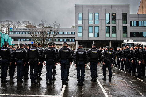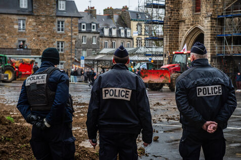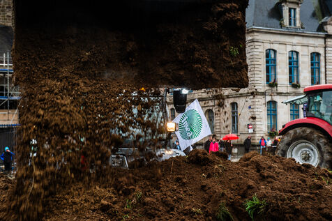 Symbolic action by the Jeunes agriculteurs (JA) and the Fédération départementale des syndicats d'exploitants agricoles, (FDSEA) des Côtes d'Armor, on Wednesday February 21, 2024 at the Saint-Brieuc prefecture. After blocking the RN12, the farmers dumped several skips of earth in front of the large number of gendarmes and police officers present, to create a meadow. A tractor then sowed the seeds of the future meadow, in reaction to the ban on turning over permanent meadows.