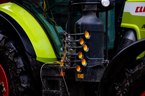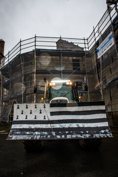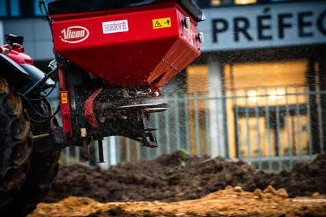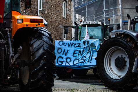 Action symbolique des Jeunes agriculteurs (JA) et de la Fédération départementale des syndicats d'exploitants agricoles, (FDSEA) des Côtes d'Armor, le mercredi 21 février 2024 à la préfecture de Saint-Brieuc. Apres avoir bloqué la RN12, les agriculteurs.trices, ont déversé plusieurs bennes de terre devant les gendarmes et policiers présents en grand nombre, de façon à constituer une prairie. Un tracteur a donc semé les graines de la future prairie, ceci en réaction à l'interdiction de retournement des prairies permanentes.