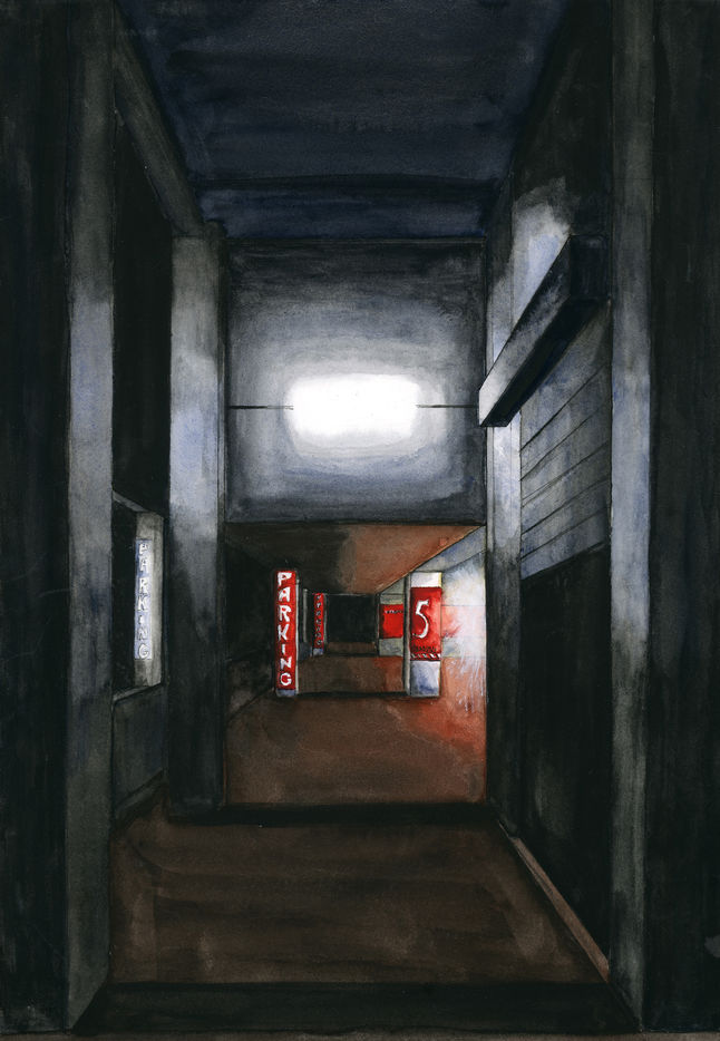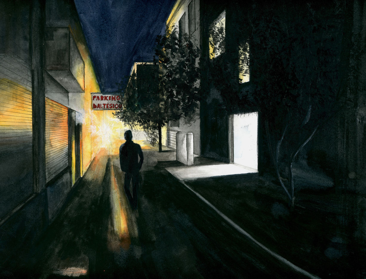 Central area of Exarcheia, Athens, during the lockdown. I wanted to work in painting on the fascinating lights of Exarcheia.